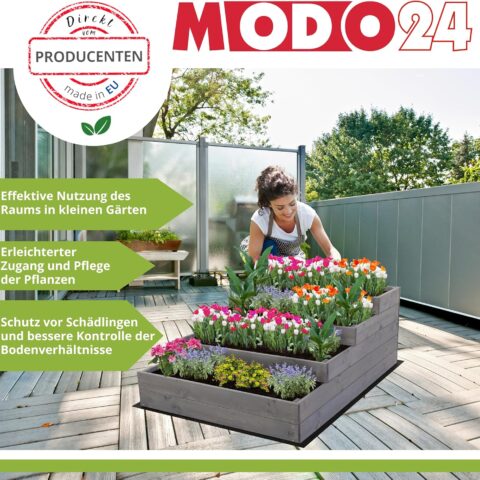 Hochbeet Holz, 4-stufiger Pflanzkasten, Blumenkasten, Gemüsebeet, Kräuterbeet, Anzuchtset, Anzuchtkasten, mit Gartenvlies als Unterlage und Schrauben, Abmessungen 54x30x120 cm, Farbe: Grau