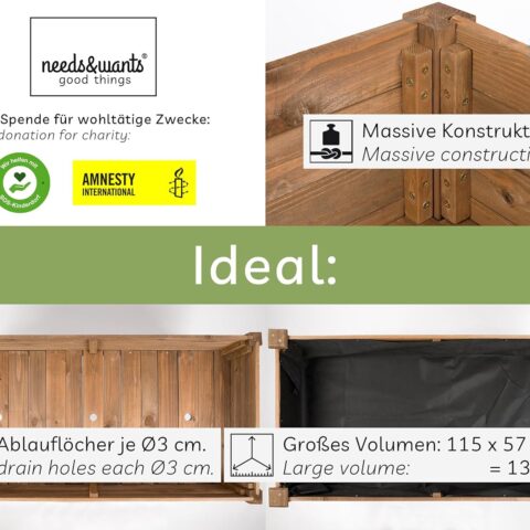 needs&wants® Großes Hochbeet aus Holz für Garten Balkon Terrasse, Pflanzkasten Bausatz XL rechteckig schmal mit Vlies-Folie, Kräuterbeet Pflanzenkasten deko, 121 x 63 x 75 cm, dunkel-braun