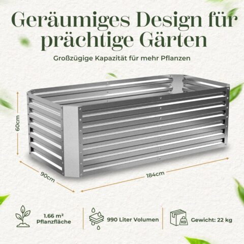 Gabiona | Hochbeet Metall verzinkt 184x90x60 cm – Großes Hochbeet für Garten, Gemüse, Kräuter & Blumen – Wetterfest, rostfrei, stabil – 990 L Volumen – Pflanzkasten rechteckig