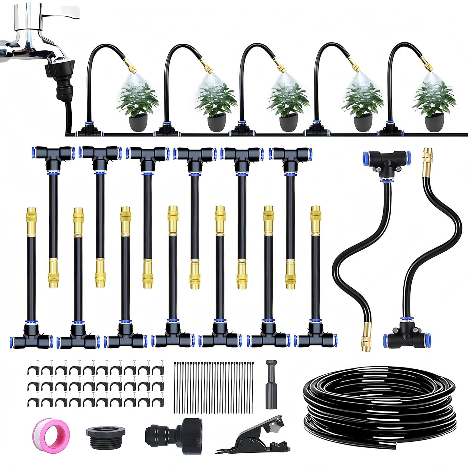 Produktliste: 1*15m PU-Schlauch, 15*Messingdüsen, 30* Schlauchbündel, 30*Schlauchbinder, 1*Schlauchschneider, 1*Kernbuchse, 1 *Klebeband, 1 *Wasserhahnanschluss, 1 *Endstopfen