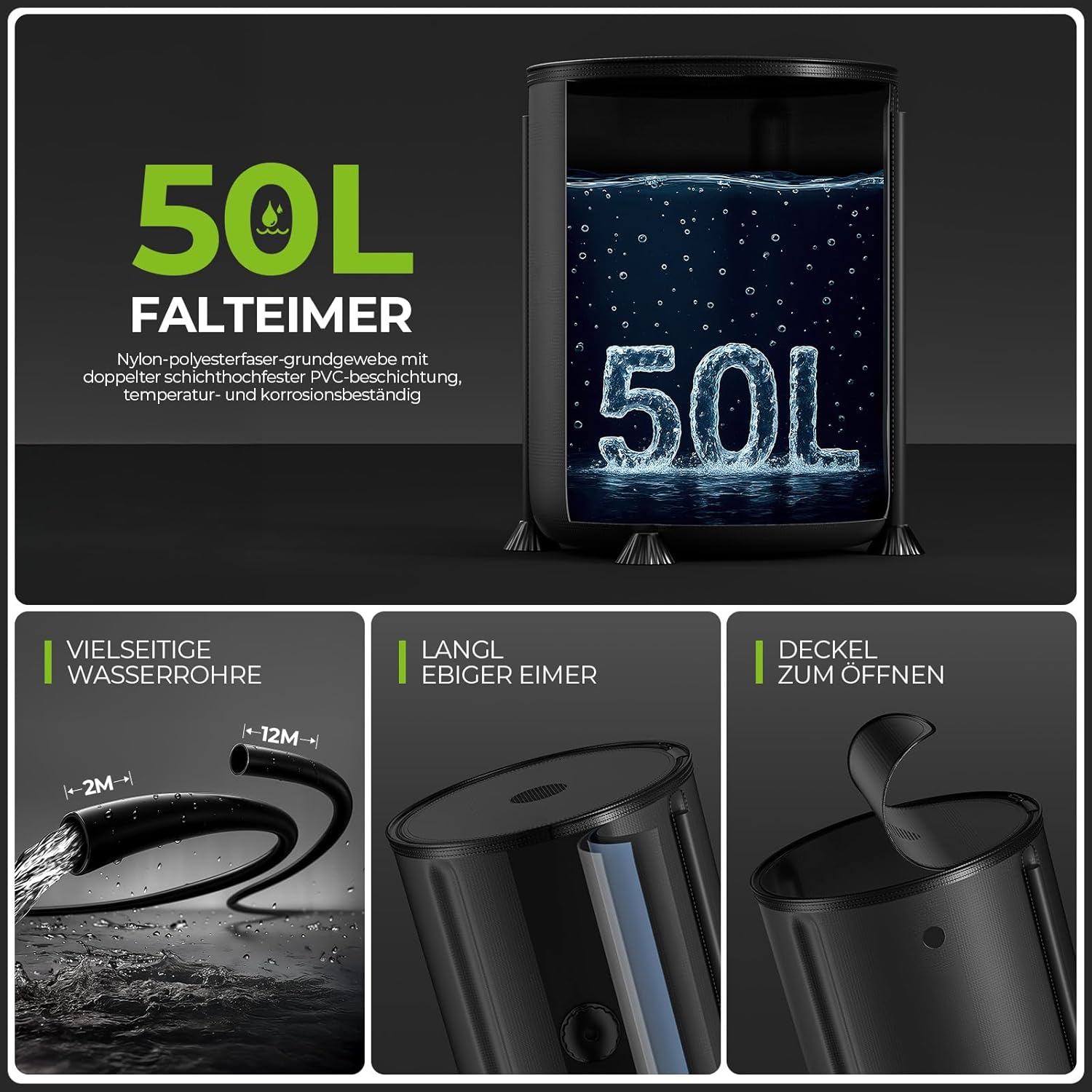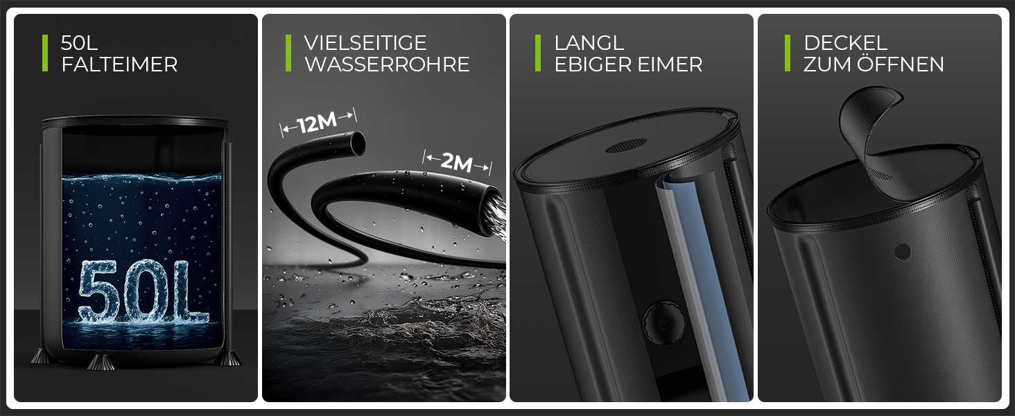 【50L Large Capacity Bucket】: Reduziert die Häufigkeit des Nachfüllens und erhöht die Benutzerfreundlichkeit. Hergestellt aus Nylon-Polyesterfaser-Grundgewebe mit einer zweischichtigen hochfesten PVC-Beschichtung für hervorragende Temperatur- und Korrosionsbeständigkeit. ROHS-konform