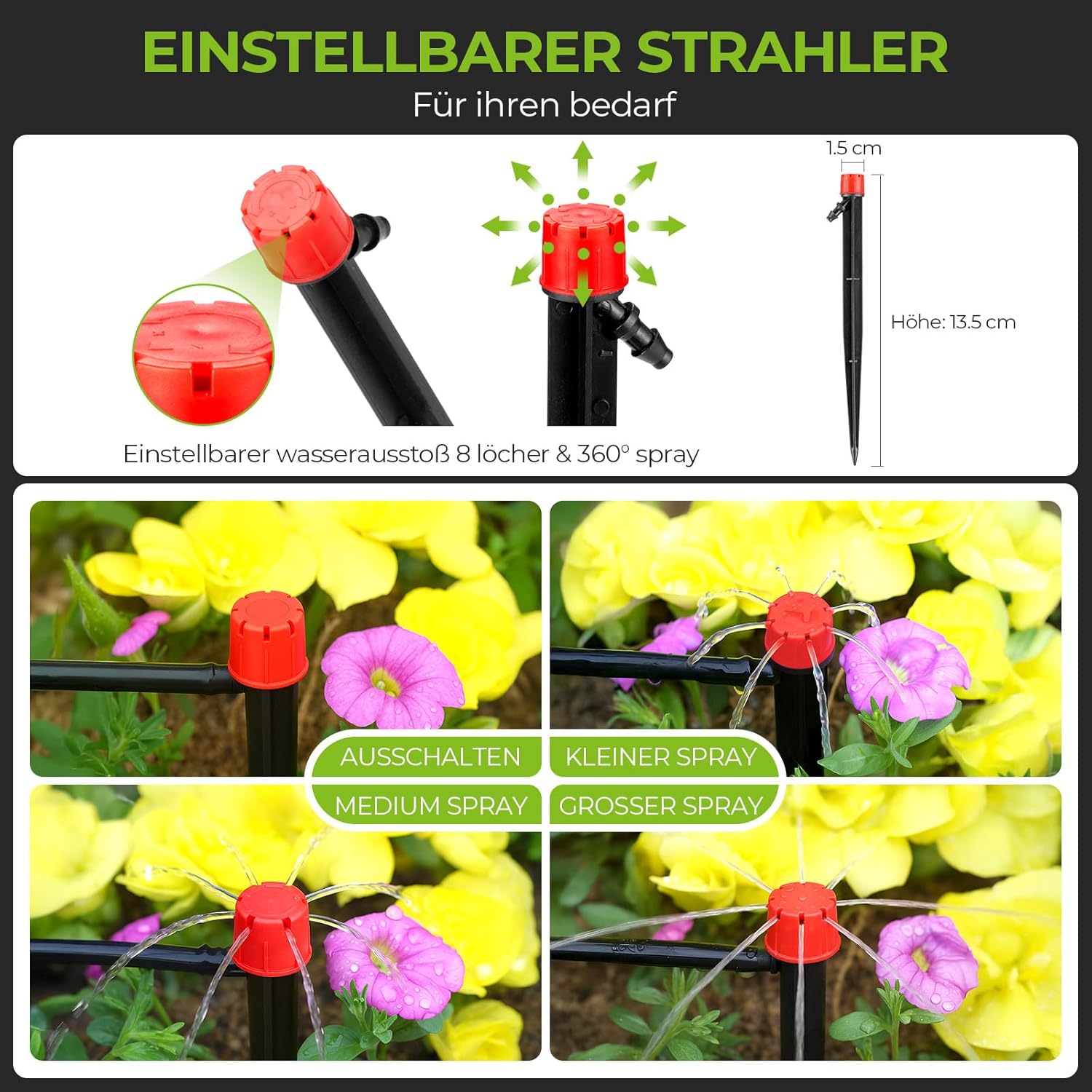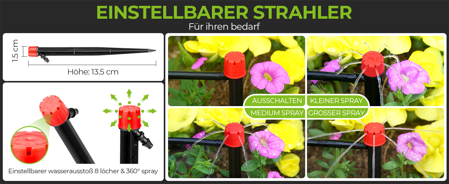 【8-Auslauf Tropf-Emitter】: Einstellbarer Mehrfachauslauf mit 0-360° Sprühbereich. Präzise Regulierung des Wasserflusses, max 160L/H. Es kann Ihre vielfältigen Bewässerungsbedürfnisse vollständig erfüllen und Ihr eigenes Bewässerungsschema anpassen