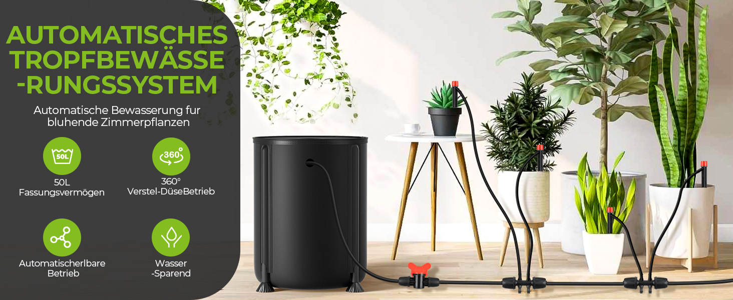 Bewässerungssystem, Automatische Bewässerung mit 25-Watt Wasserpumpe & 50-Liter Eimer, Niedrigwassersensor Bewässerungssystem für Garten Balkon Zimmerpflanzen Tröpfchenbewässerung