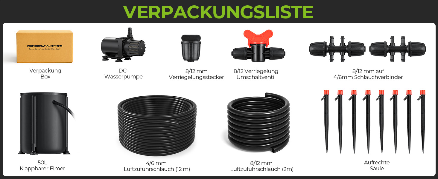 【Automatisches Tropfbewässerungssystem】: 25W intelligente Wasserpumpe, 50L-Eimer, 8pcs Tropf-Emitter, 5pcs aufrechte Säule, 2M 8/12mm & 12M 4/6mm Tropfschläuche, 2pcs Schlauchverbinder, AC-Adapter, und mehr