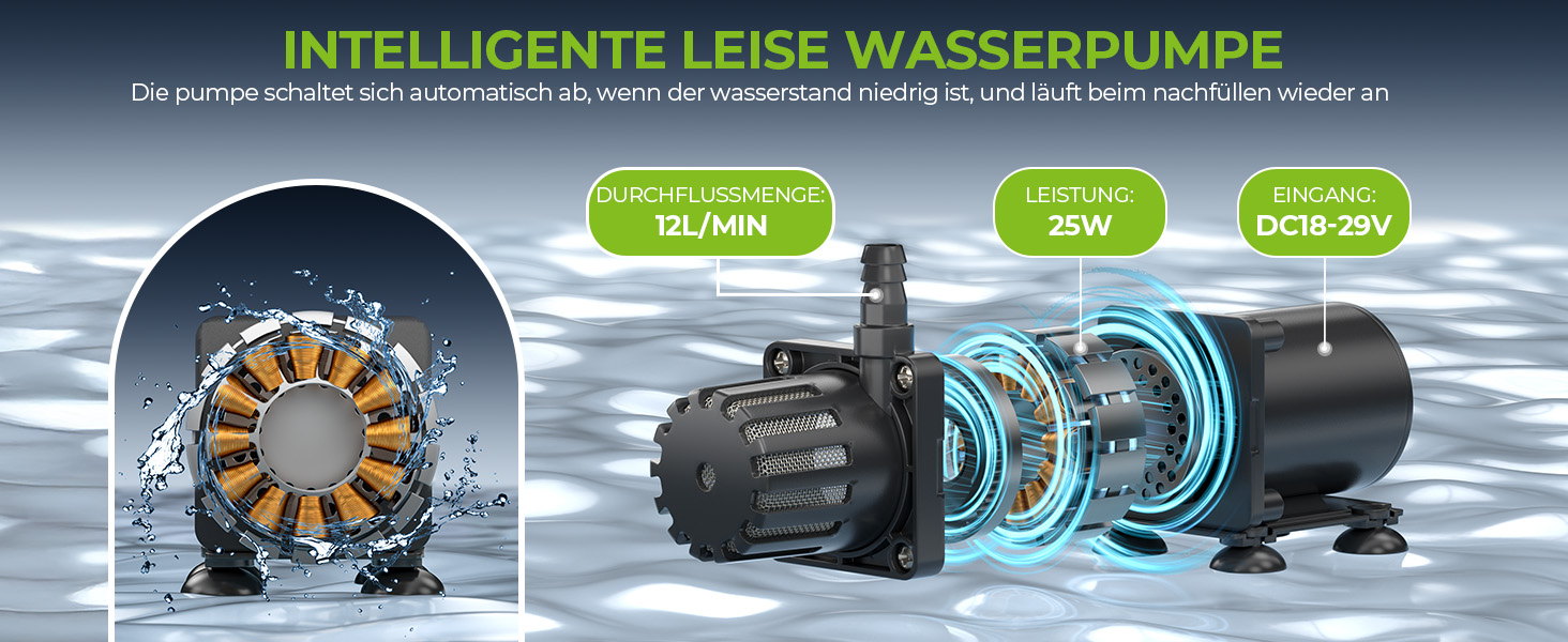 【25W Intelligente Wasserpumpe】: Liefert bis zu 12 L/min Durchflussmenge. Verfügt über einen Niedrigwasserstandssensor für automatischen Stopp/Start je nach Wasserstand. Hilft Ihnen, intelligente Bewässerung einfach zu realisieren und die Effizienz der Bewässerung zu verbessern.