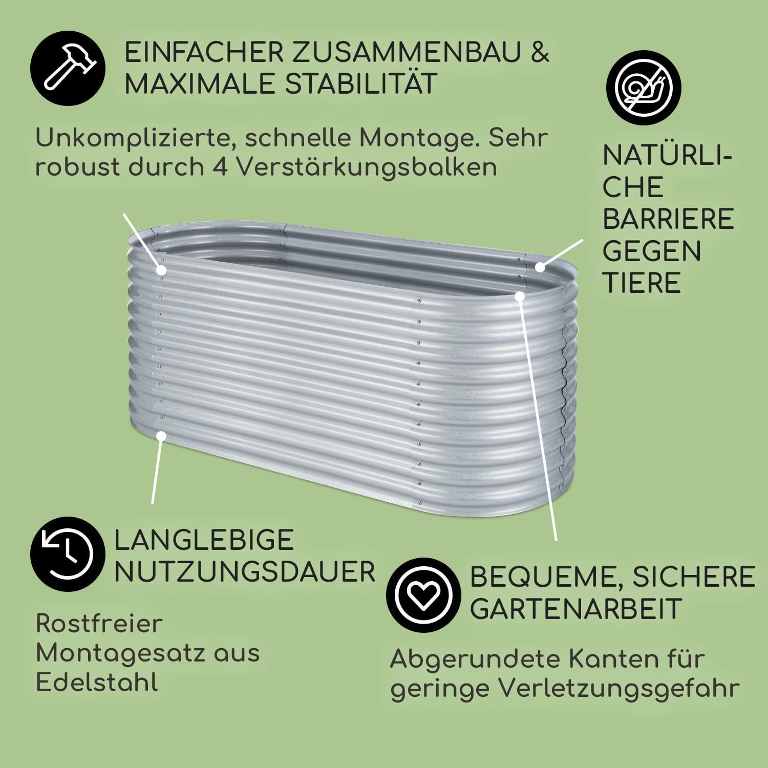 EINFACHE UND SCHNELL INSTALLATION: Kinderleicht lässt sich dieses große Alu-Hochbeet, das groß und oval ist, mit minimalem Aufwand aufstellen. Darüber hinaus kannst du die Größe anpassen und Erweiterungen verwenden oder ein Foliendach anbringen.