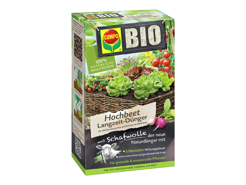 Der COMPO BIO Hochbeet Langzeit-Dünger mit Schafwolle zeichnet sich durch seine sehr gute Sofort- sowie gleichmäßige Langzeitwirkung von bis zu fünf Monaten aus – damit reicht 1 x düngen für eine komplette Saison. Er ist ideal geeignet für alle Arten von Gemüse, Obst, Kräutern und anderen Pflanzen im Hochbeet. Die Langzeitdünger mit Schafwolle sind ein echte Innovation, da sie sind rein organisch sind und 50% Schafwolle enthalten.