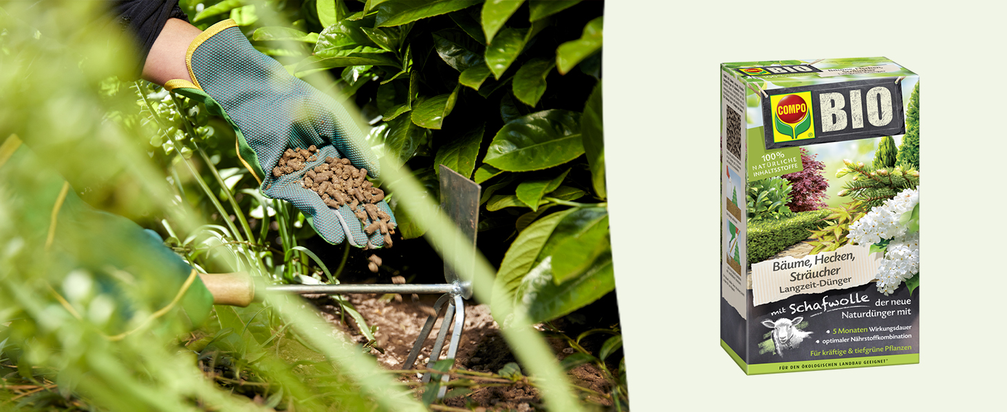 COMPO BIO Sträucher, Hecken & Bäume LangzeitdüngerOrganischer Naturdünger mit Schafwolle für alle Koniferen, Hecken, Sträucher und Bäume