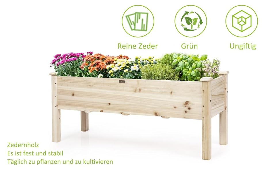 Gefertigt aus starkem und widerstandsfähigem Zedernholz ist dieser erhöhte Pflanzkasten robust und außergewöhnlich stabil. Mit ihm können Sie Ihre eigenenPflanzen anbauen und pflegen, ohne Rückenschmerzen zu bekommen oder sich hinknien zu müssen, und er bietet Ihnen außerdem Pflanzmöglichkeiten auf Ihrer Terrasse, Ihrem Balkon und überall sonst. Und unser erhöhtes Gartenbeet gewährleistet ein gesundes Wachstum für Gemüse und Blumen mit Drainagelöchern für eine gute Belüftung und Atmungsaktivität.