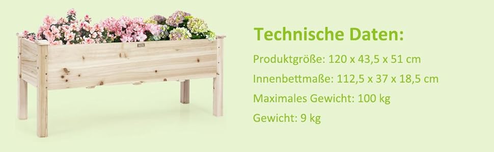 【Angemessener Pflanzbereich】 Die Gesamtmaße betragen 120 x 43,5 x 51 und die Innenmaße 112,5 x 37 x 18,5 cm. Unser Hochbeet bietet Ihnen eine geräumige Fläche, um Pflanzen auf Ihrer Terrasse, Ihrem Balkon oder sogar im Innenbereich anzubauen.