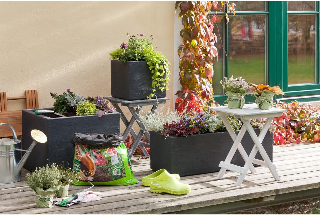 Die Dehner Blumenkübel-Serie Palermo, anthrazit kann und wird sich an vielen Plätzen in Ihrem Outdoor-Ambiente nützlich machen. Gerade die edle Stein-Optik harmoniert besonders schön mit allen Arten von Grünpflanzen und Blumen. Möchten Sie eine klassische und pflegeleichte Begrünung Ihrer Terrasse, dann bepflanzen Sie den Kunststoff Blumenkübel doch mit immergrünen Koniferen oder Buchsbüschen. Moderner wirken zarte Gräser oder Bambuspflanzen, die zugleich noch einen Sichtschutz zum Nachbarn bilden können. Oder sind Sie ein Freund von Abwechslung bei der Dekoration? Kein Problem. In dem Kunststoff Blumenkübel können Sie zu jeder Jahreszeit andere Pflanzen setzen. Lassen Sie auf die klassischen Frühjahrsblüher wie Tulpen, Narzissen und Vergissmeinnicht prächtige Sommerblumen wie Geranien, Petunien oder auch schöne Dahlien folgen. Im Herbst entfachen Sie ein Farbenfeuerwerk mit Astern, Chrysanthemen und Co und im Winter setzen Sie mit Koniferen in Ihrem Palermo-Set weihnachtliche Akzente.