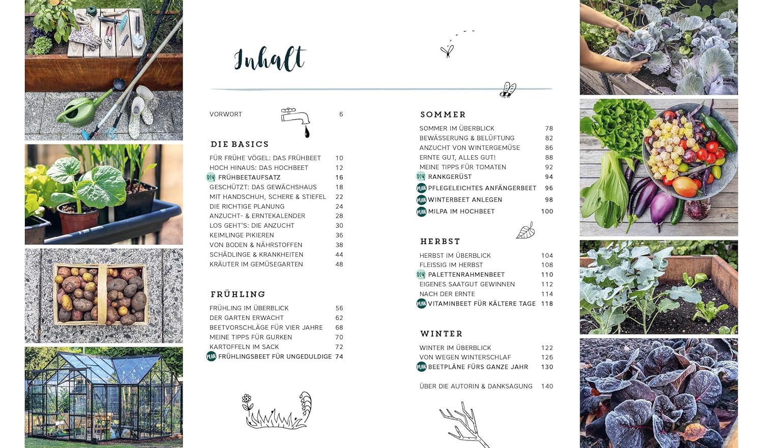 Das Gartenjahr auf einen Blick : für jede Jahreszeit eine Übersicht Kompaktes  Gartenwissen : Beetformen, Grundausstattung, Anzucht und Planung Bauanleitungen: Frühbeetaufsatz, Rankgerüst, Paletten-Hochbeet, Gewächshaus und mehr Extra: Anzucht und Erntekalender