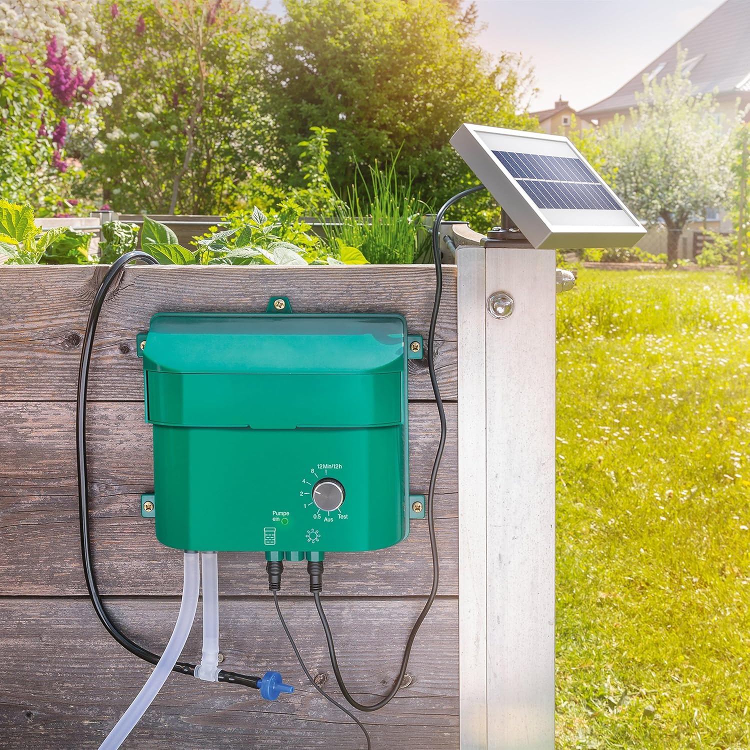 Automatische Pflanzenbewässerung mit Solarbetrieb und integriertem AkkuSparsame Tröpfchenbewässerung 2-mal täglichSaugt Wasser selbsttätig aus einem Vorratsbehälter anWählbare Fördermenge zwischen 0,5 und 6 l je BewässerungsintervallHochwertiges kristallines Solarmodul15 frei positionierbare Wasserauslässe (Tropfer) und Schlauchhalter