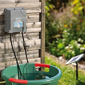 Kernstück des Systems ist die Steuereinheit mit eingebautem Bewässerungscomputer. In ihr sind die Membranpumpe, der Akku und das Bedienpanel gut geschützt verbaut. Unten an dem soliden Gehäuse befinden sich der Hauptschalter und alle benötigen Anschlüsse. Das Kabel des Wasserstandsensors und das Ladekabel vom Solarmodul brauchen Sie hier nur anzustecken. Die Schläuche für die Wasserversorgung und Wasserabgabe schließen Sie werkzeuglos an den benachbarten Schlauchtüllen an.
