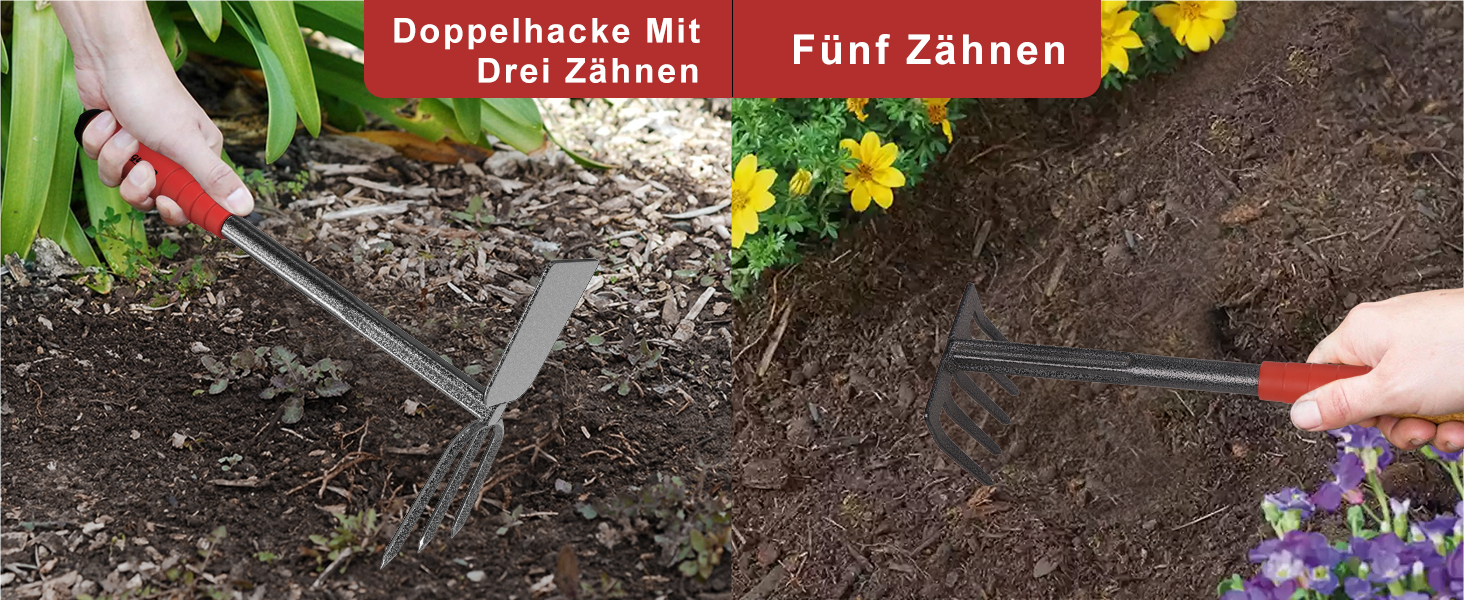 Doppelhacke mit drei Zähnen/fünf ZähnenDiese beiden Werkzeuge jäten oder lockern steinigen Boden problemlos, dringen in harte Böden ein und lockern Unkraut und eignen sich auch ideal als Furchengrubber.