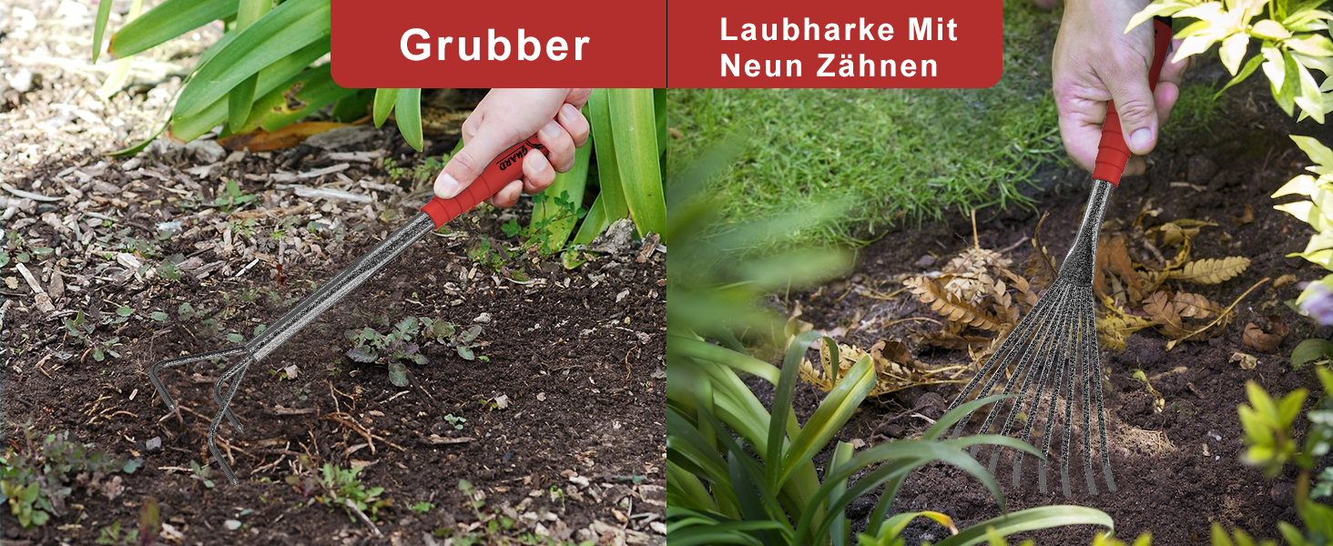Grubber/Laubharke mit neun ZähnenBeide Werkzeuge pulverisieren und belüften den Boden perfekt und die hervorragenden Anti-Rutsch-Eigenschaften der Griffe verringern die Ermüdung von Arm und Arm.