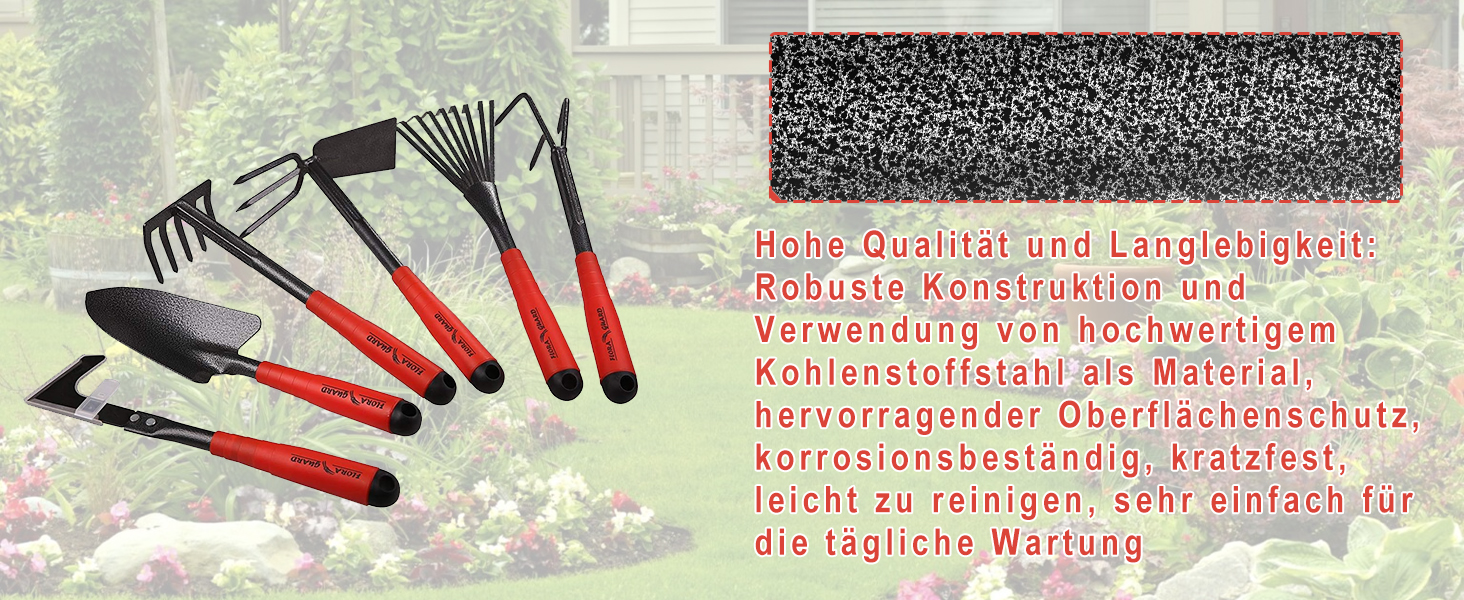Das FLORA GUARD 6-teilige Gartenwerkzeug-Set ist eine fantastische Ergänzung für das Arsenal eines jeden Gärtners. Diese Werkzeuge sind für mich schnell unverzichtbar geworden.Die Köpfe aus Kohlenstoffstahl sind langlebig und bewältigen mühelos verschiedene Gartenarbeiten. Ob Unkraut jäten, pflanzen oder harken, diese Werkzeuge erledigen die Aufgaben effizient. Sie sind gut verarbeitet und angenehm in der Anwendung, was die Belastung meiner Hände und Handgelenke reduziert.Das Set umfasst eine großartige Auswahl an Werkzeugen, wodurch es vielseitig für unterschiedliche Gartenbedürfnisse ist. Ich liebe besonders die Handharke zum Aufräumen von Blättern und Abfall. Die kompakte Größe dieser Werkzeuge erleichtert auch die Aufbewahrung, wenn sie nicht in Gebrauch sind.Insgesamt kann ich das FLORA GUARD Gartenwerkzeug-Set sowohl Anfängern als auch erfahrenen Gärtnern wärmstens empfehlen. Es bietet ein hervorragendes Preis-Leistungs-Verhältnis für die Qualität und die Vielfalt der Werkzeuge, die Sie erhalten. Seitdem ich diese Werkzeuge benutze, ist die Gartenarbeit für mich angenehmer und produktiver geworden.