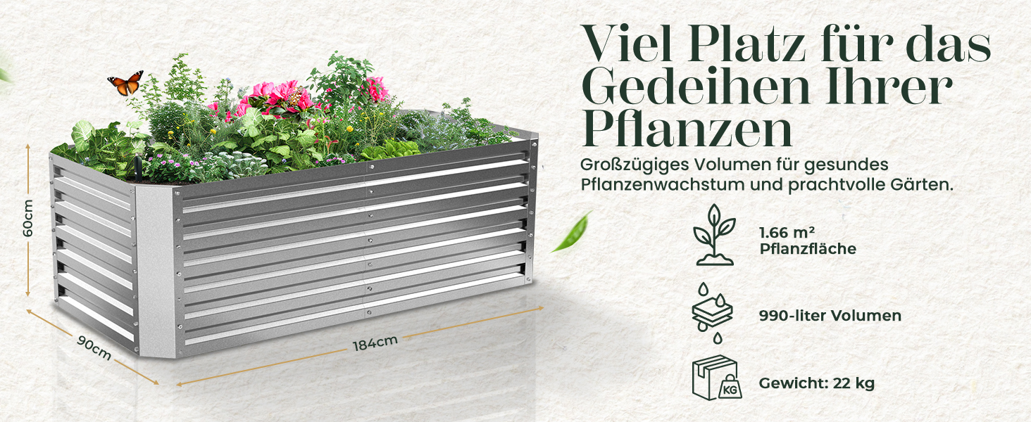 🌱 Großes Pflanzvolumen – Maße 184 x 90 x 60 cm, bietet 990 Liter Fassungsvermögen und 1,66 m² Pflanzfläche für Gemüse, Kräuter, Blumen oder Salate.