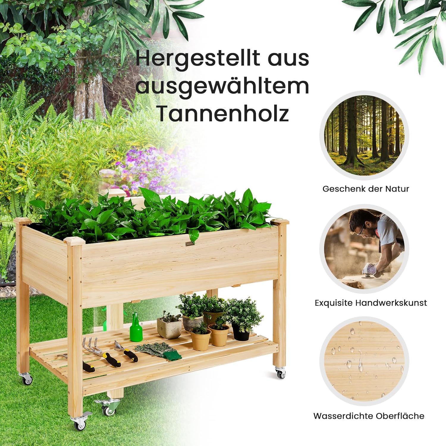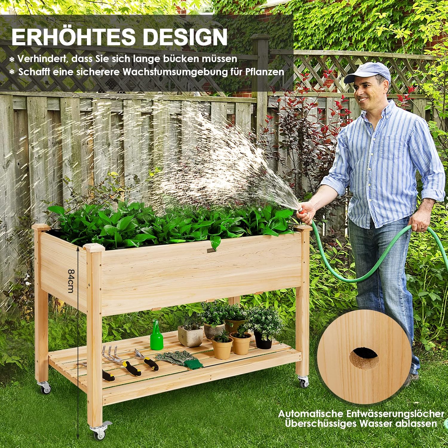GOPLUS Hochbeet mit Rollen, Gartenbeet mit Ablage & Abflusslöcher, Pflanzbeet aus Tannenholz für Garten & Terrasse, Natur (mit Rollen, 120x59x84 cm)