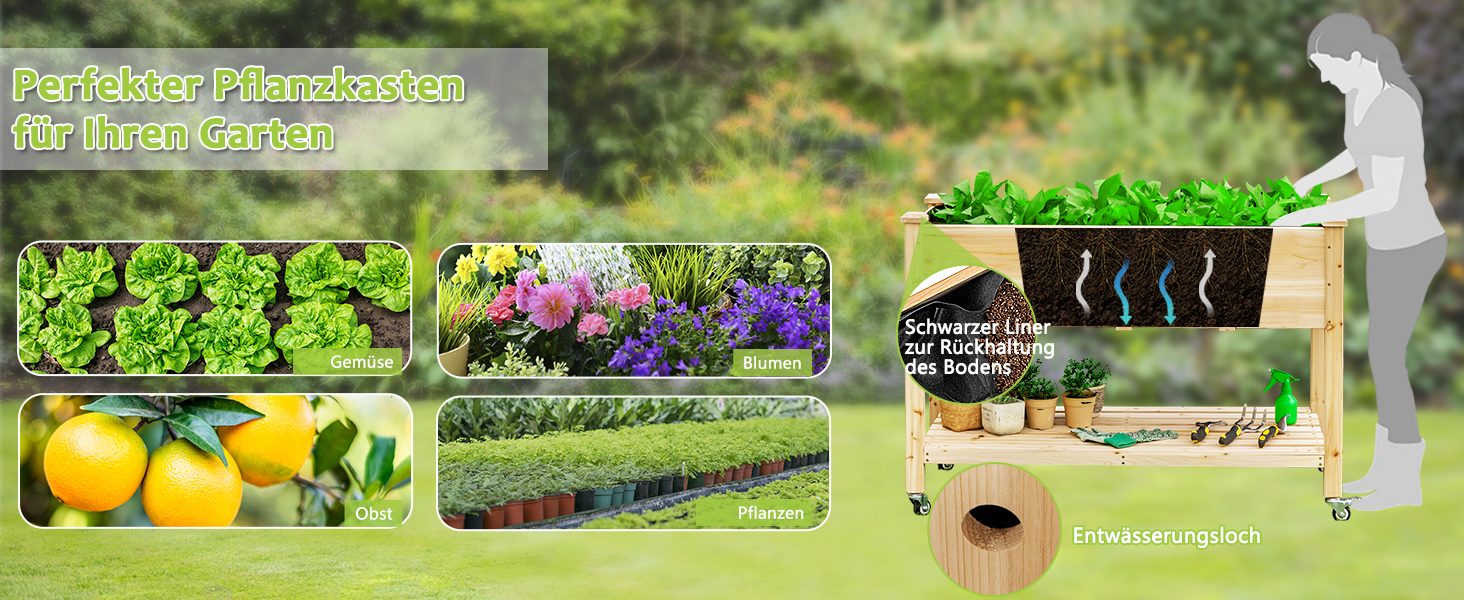 Praktisches Design: Mit dem 84 cm hohen Pflanzbeet können Sie diese Pflanzen leicht verwalten, ohne sich bücken zu müssen. Und die versteckten Abflusslöcher können vernünftig ablassen, was das Pflanzen sehr erleichtert.