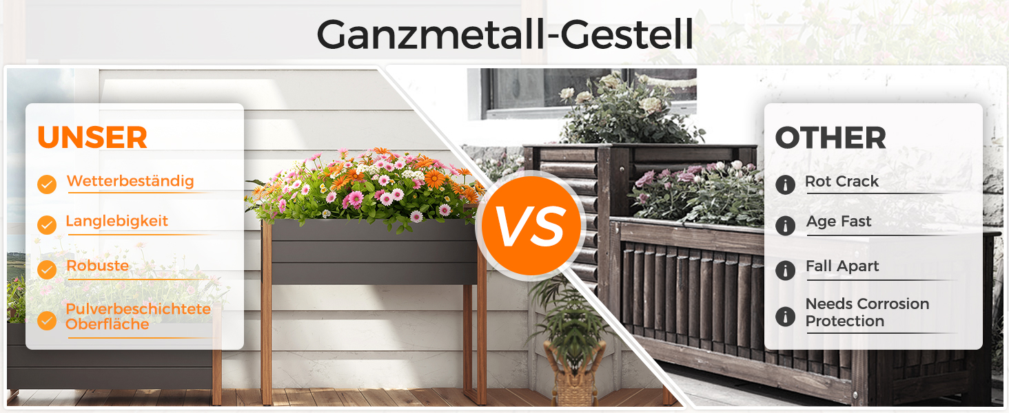 GANZMETALLKONSTRUKTION: Unser Hochbeet wird von einem Ganzmetallrahmen getragen, der mit einer hochwertigen Pulverbeschichtung versehen ist, um Robustheit und Haltbarkeit zu gewährleisten. Im Vergleich zu hölzernen Pflanzgefäßen ist dieses Kräuterbeet witterungs- und rostbeständig und wird nicht verrotten oder reißen.