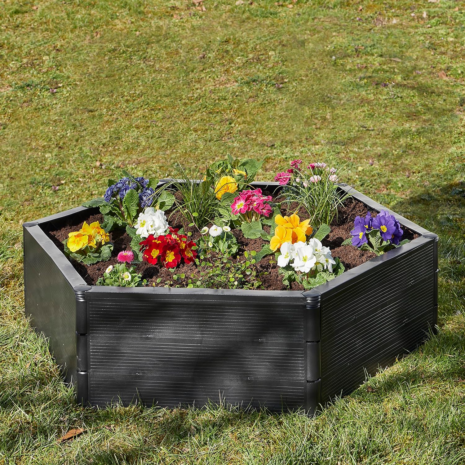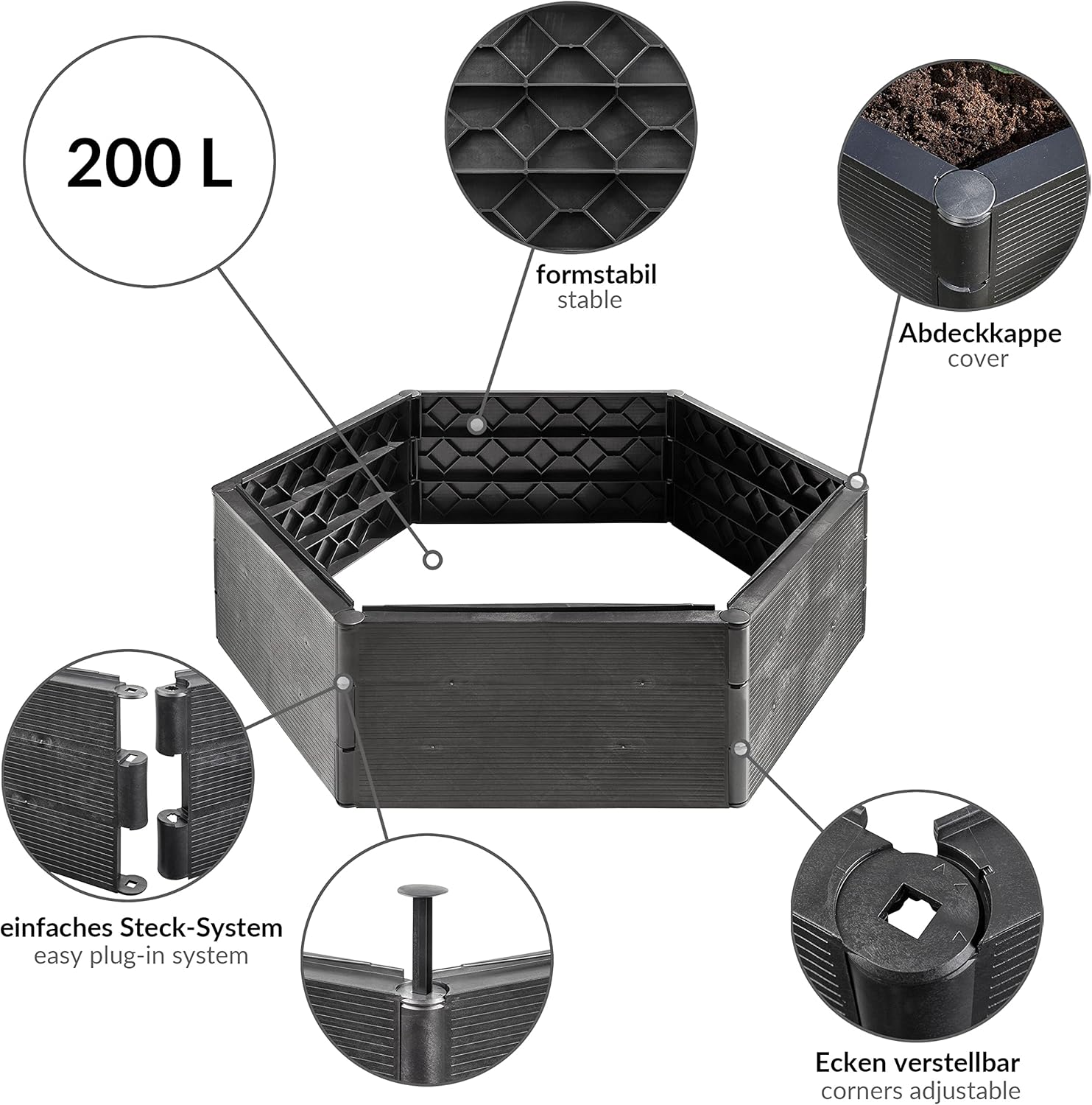 AUFBAU – Das Kräuterbeet lässt sich ohne Werkzeug spielend leicht zusammen stecken und kann umgehend mit Grünschnitt und Erde befüllt werden. Bei der Montage lassen sich die Ecken in drei Positionen einstellen, somit kann das Gemüsebeet nicht nur im Sechseck, sondern in Kombination mit mehreren Sets im Quadrat oder Rechteck gestellt werden.