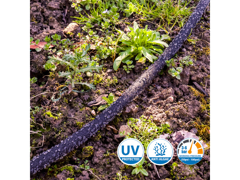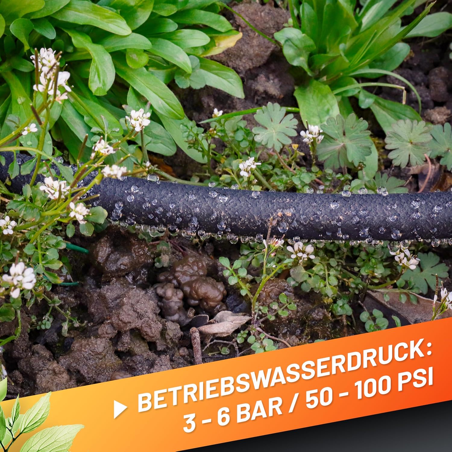 Der Tropfschlauch kann bei einem Betriebswasserdruck von 3 – 6 bar / 50 – 100 psi verwendet werden. 💦
