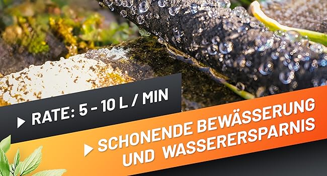 Der Schlauch gibt das Wasser kontrolliert und tropfenweise mit einer Rate von 5 – 10 L / Minute entlang des Tropfschlauches ab und spart im Vergleich zu herkömmlichen Bewässerungsmethoden bis zu 70% der Wassermenge. Mit 1/2 Zoll Schraubanschluss für gängige Wasserhähne. Eine ideale Lösung zur Bewässerung von Jungpflanzen und Beeten. 💦