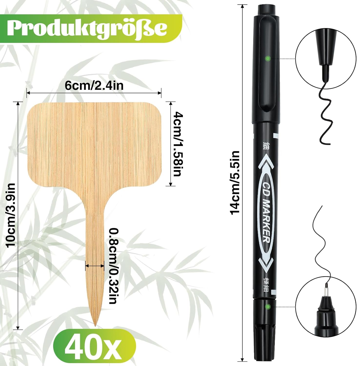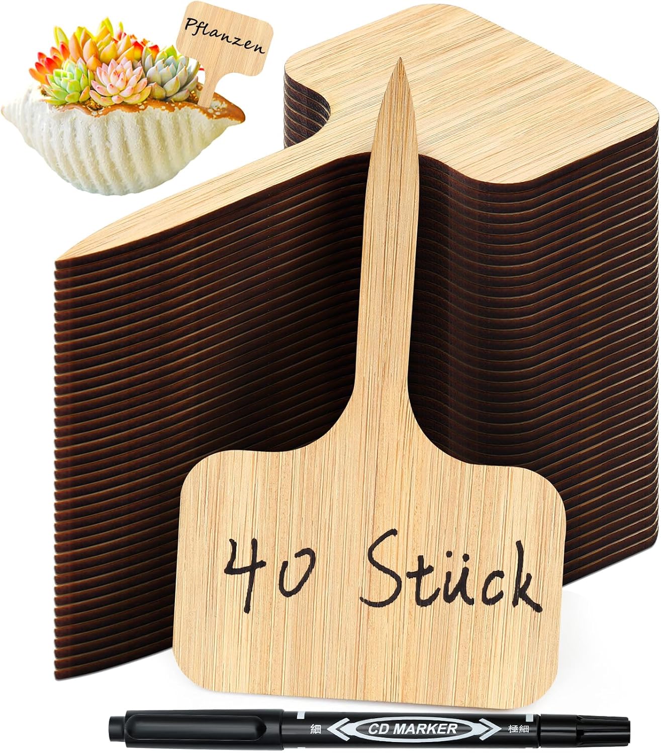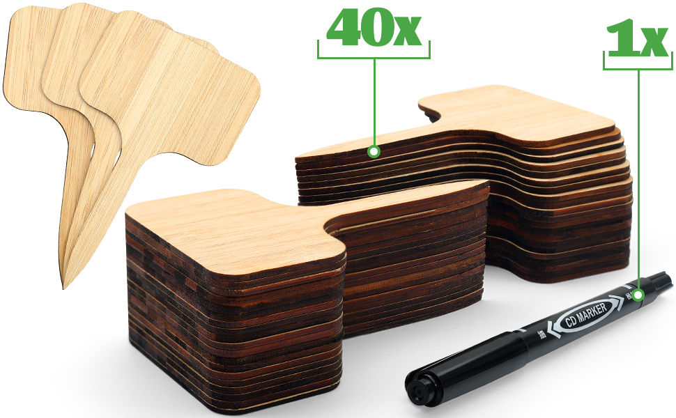 🌾【Hochwertiges Set】 40 Stück Pflanzenschilder aus Bambus, mit schwarzen Filzstift (zwei Spitzen). Größe der Gartenstecker: 10x6x0,2 cm.
