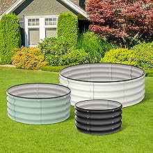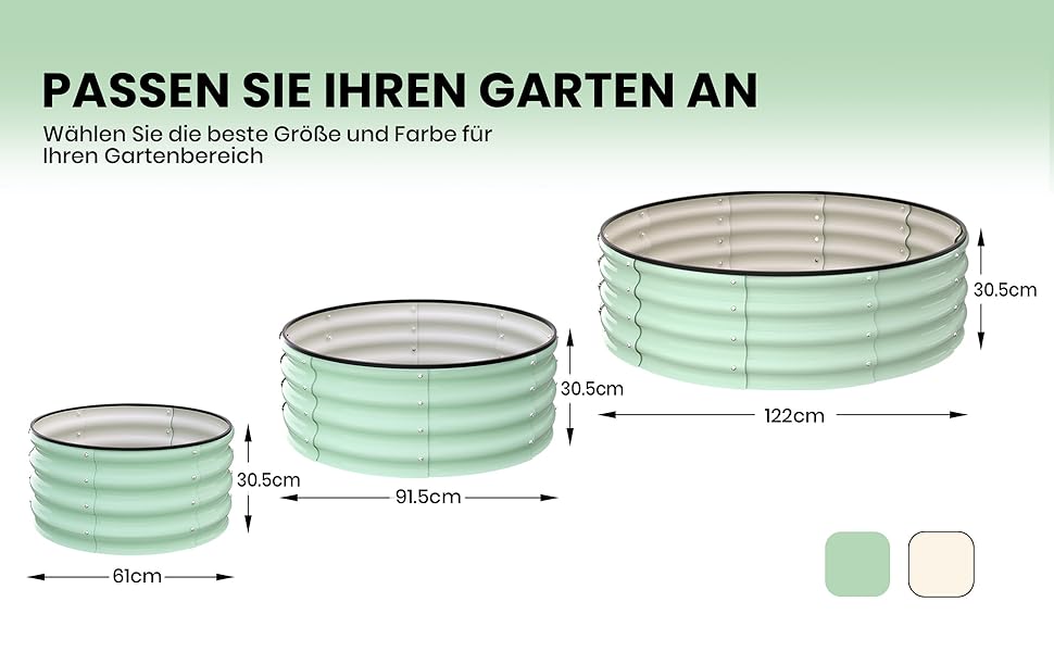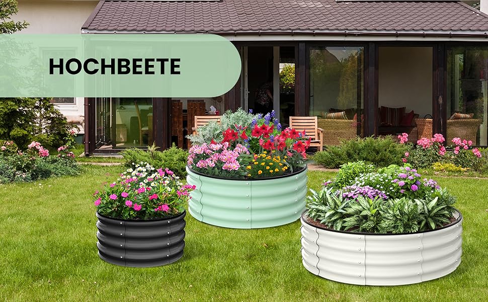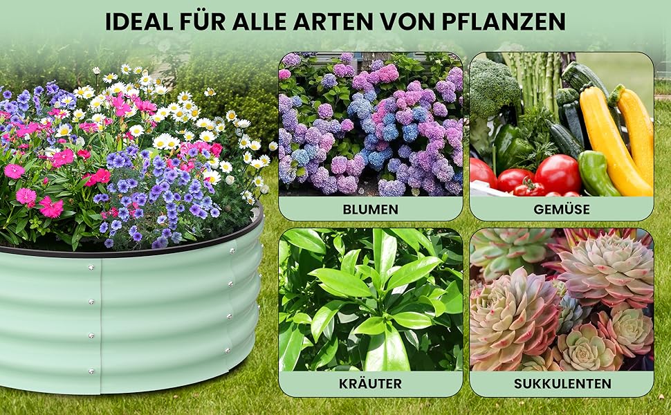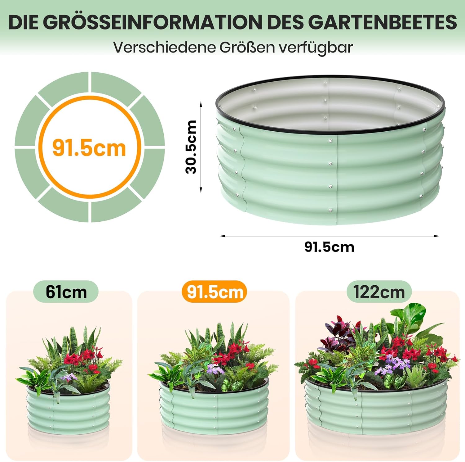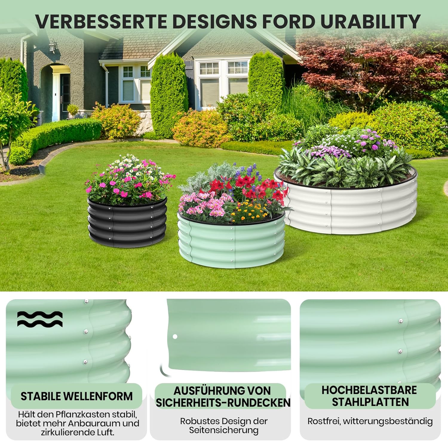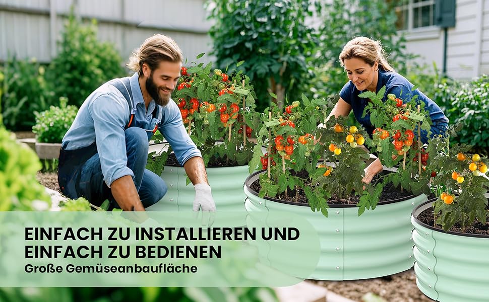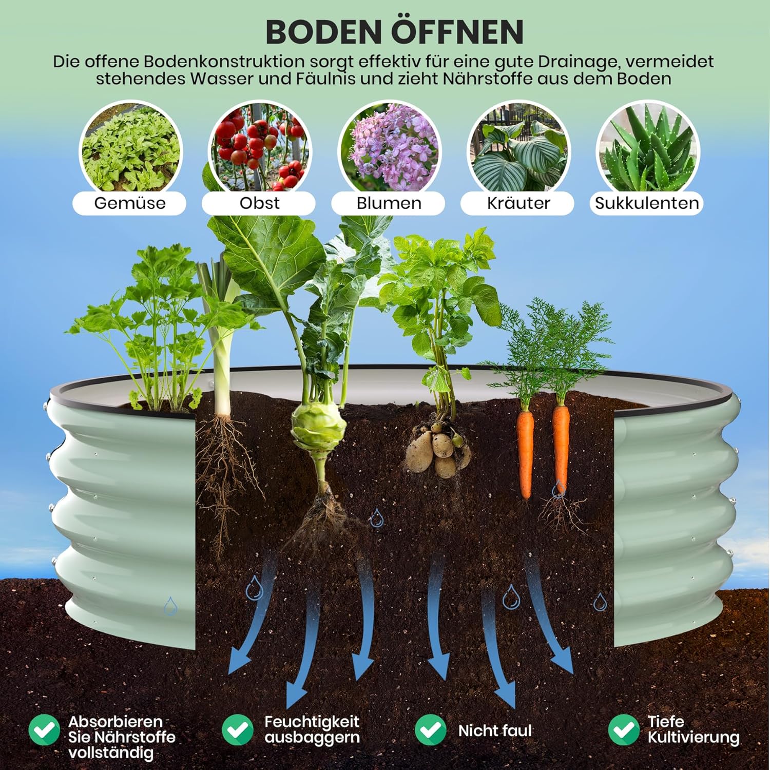 Langlebigkeit: Unser Hochbeet ist aus dickem, pulverbeschichtetem, verzinktem Stahl gefertigt und so gebaut, dass es dem Test der Zeit standhält. Im Gegensatz zu fadenscheinigen Kunststoff- oder Holzoptionen, die sich mit der Zeit verschlechtern, ist dieses robuste Pflanzgefäß resistent gegen Rost und raue Wetterbedingungen. Diese Langlebigkeit stellt sicher, dass Ihre Investition viele Gartensaisons lang hält. Bauen Sie Ihre Lieblingspflanzen wie Römersalat, Gurken und Erdbeeren mit dem Vertrau