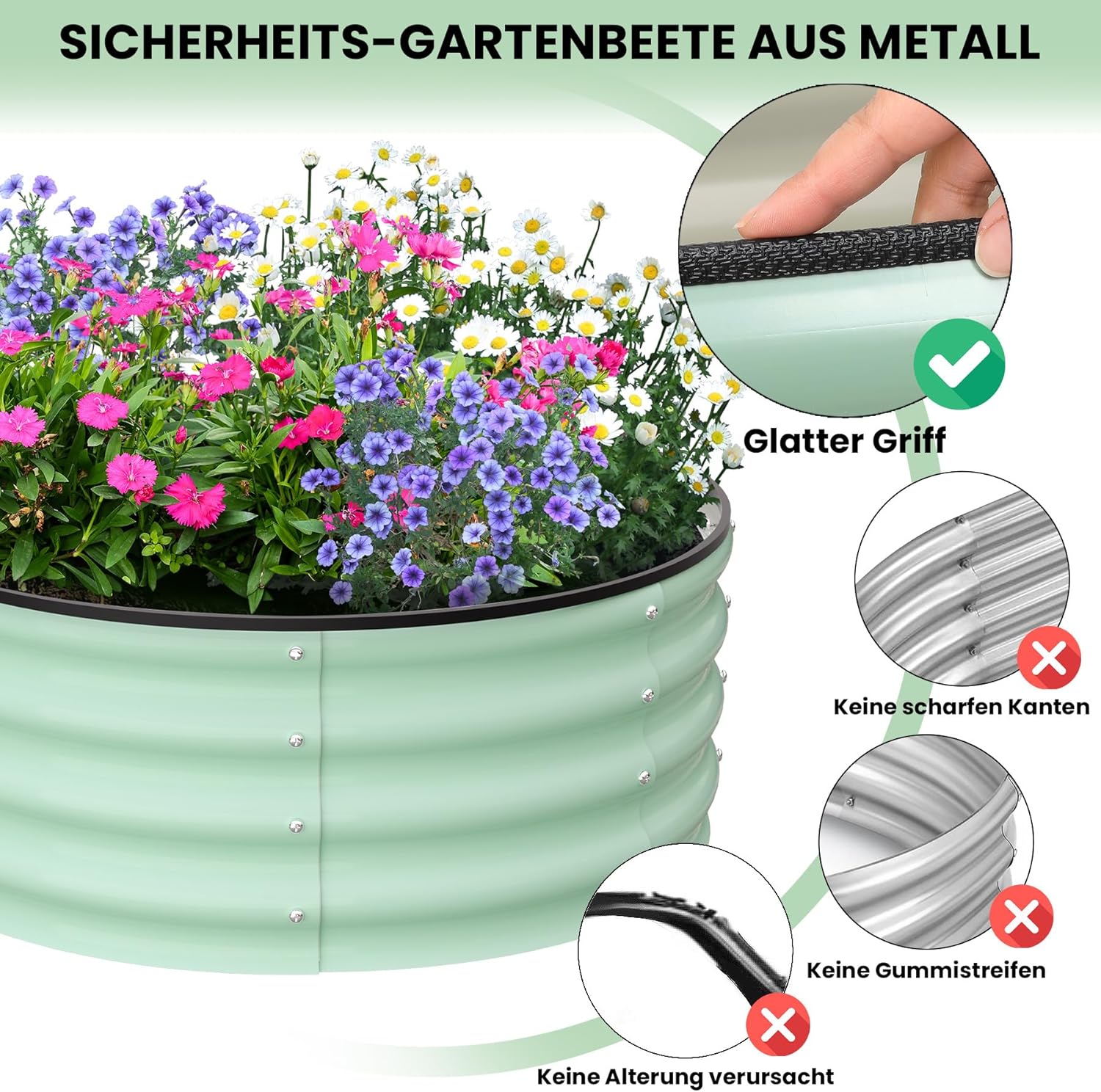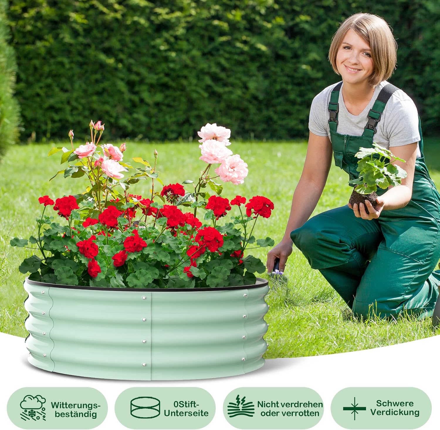 Dieses Gartenbeet ist aus dickem, pulverbeschichtetem, verzinktem Stahl gefertigt und auf lange Lebensdauer ausgelegt. Im Gegensatz zu herkömmlichen Kunststoff- oder Holzoptionen, die sich mit der Zeit verschlechtern, widersteht unser robustes Design Rost und hält rauen Wetterbedingungen stand. Sie können Ihre Lieblingspflanzen getrost anbauen, da Sie wissen, dass dieses Hochbeet alle Jahreszeiten übersteht, was es zu einer klugen Investition für Ihre Gartenreise macht.