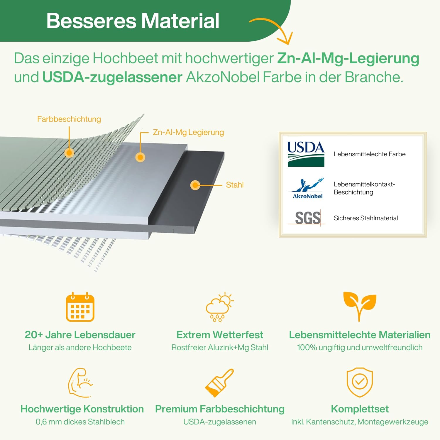 LANGLEBIGES & NACHHALTIGES MATERIAL: Unser speziell entwickeltes MZ 2.0-Material kombiniert eine Zink-, Magnesium- und Aluminiumbeschichtung mit der preisgekrönten, USDA-zugelassenen AkzoNobel-Farbe. Dieses Material ist 100 % sicher, umweltfreundlich und bietet eine außergewöhnlich lange Lebensdauer von über 20 Jahren.