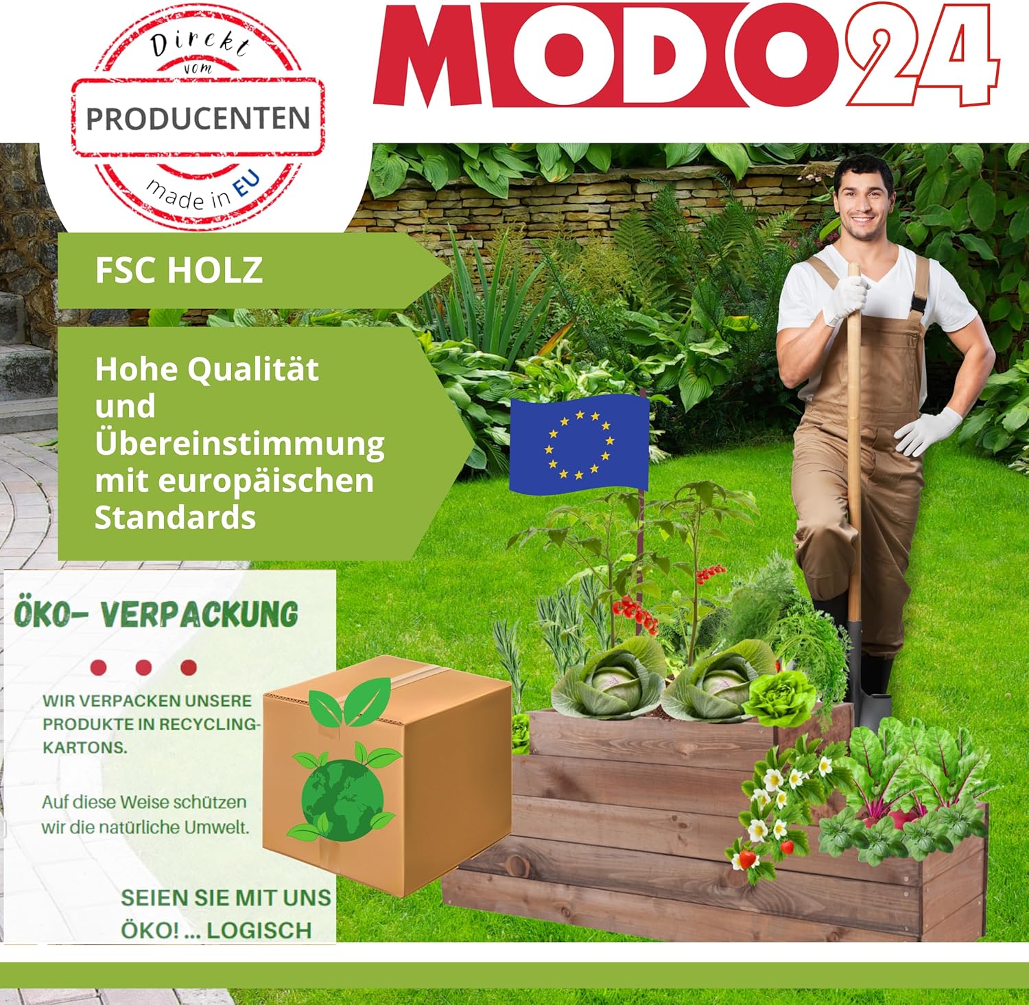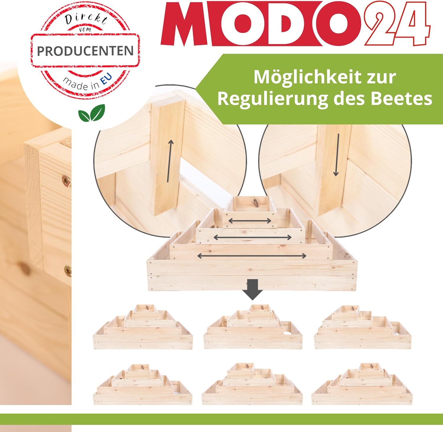 NATÜRLICHE UND DAUERHAFTE MATERIALIEN: entscheiden Sie sich für Qualität und Ökologie! Das MODO24-Beet ist aus massivem Kiefernholz gefertigt, einem natürlichen, nachwachsenden Rohstoff. Die solide Konstruktion und sorgfältige Verarbeitung garantieren eine langjährige Haltbarkeit und Witterungsbeständigkeit.