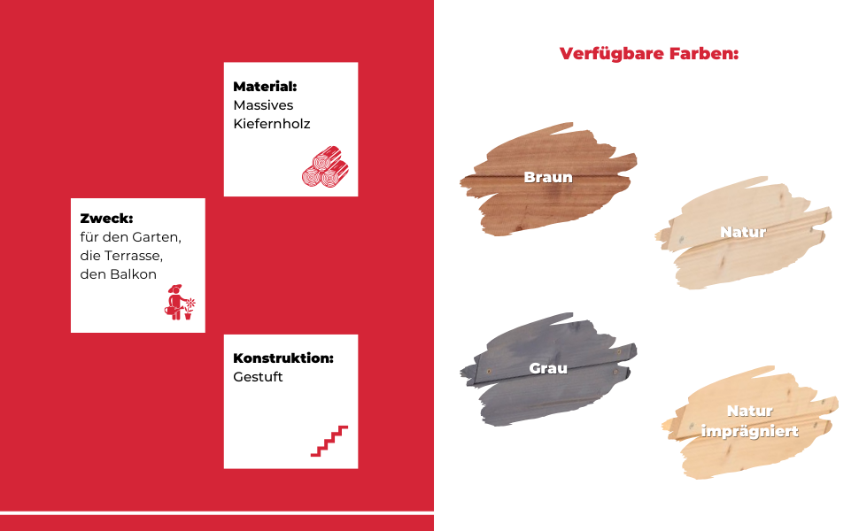 Massives Kiefernholz: Das Bett ist aus hochwertigem Kiefernholz gefertigt, das sich durch seine Langlebigkeit und sein natürliches Aussehen auszeichnet. Abgestuftes Design: Sorgt für optimales Sonnenlicht und leichten Zugang zu den Pflanzen. Vielseitige Verwendung: Ideal für den Anbau von Kräutern, Gemüse, Blumen und anderen Pflanzen. Praktisch: Erleichtert die Organisation und Pflege Ihres Gartens. Ästhetisch ansprechend: Das Holzbeet passt in jeden Garten und verleiht ihm einen natürlichen Touch. Einfacher Zusammenbau: Das Beet ist einfach zu montieren und erfordert kein Spezialwerkzeug.Natürliche Schönheit und Langlebigkeit