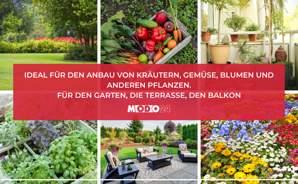 Das MODO24-Beet ist die ideale Lösung für den Anbau einer großen Vielfalt von Pflanzen. Sie können darin Kräuter, Gemüse, Blumen und sogar kleine Sträucher anpflanzen. Dank des abgestuften Designs können Sie auch auf kleinem Raum einen Mini-Gemüsegarten anlegen.
