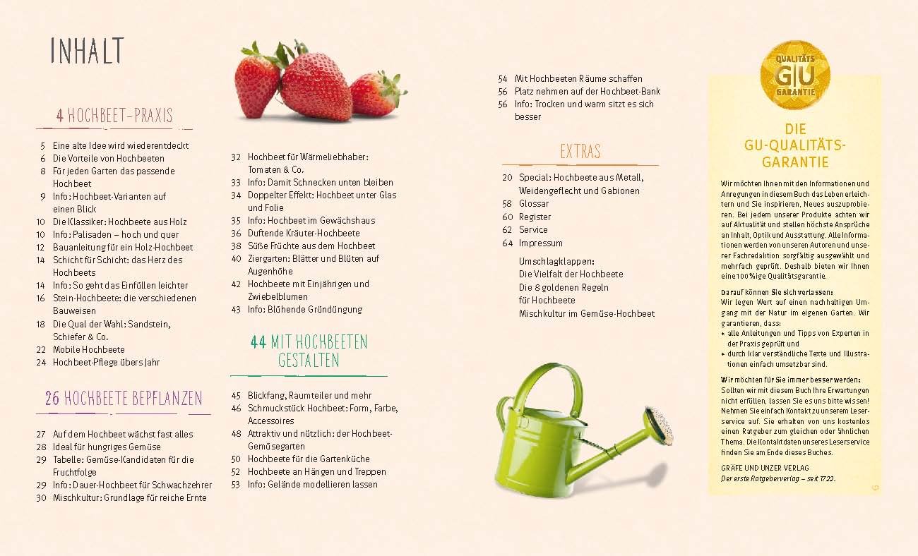 Hochbeete haben viele Vorzüge: Sie ermöglichen Gartenarbeit in bequemer Höhe und das im Inneren verrottende Material setzt Wärme und Nährstoffe frei. Letzteres kommt wärmeliebenden Gemüse-Kulturen sehr zugute: Die Pflanzen wachsen besser und bringen höhere Erträge. Außerdem lassen sich Hochbeete als attraktive Gestaltungselemente einsetzen: Mit ihrer Hilfe kann man den Garten gliedern, Räume schaffen oder Treppen und Sitzplätze auf reizvolle Weise gestalten. Und je nachdem, ob man ein Hochbeet mit verrottendem, organischem Material oder mit magerem Substrat füllt, eignet es sich für stark, mittel oder schwach zehrende Gemüse- und Obstkulturen, für Kräuter oder für Zierpflanzen. Die Beete lassen sich aus verschiedenen Materialien von Holz über Stein bis hin zu Metall oder Weidenflechtwerk errichten – so ist für jeden Gartenstil etwas dabei. Als Extra gibt’s die GU Garten und Natur Plus-App. Damit wird der Pflanzenratgeber interaktiv und hält weitere Zusatzinfos und Bilder bereit.