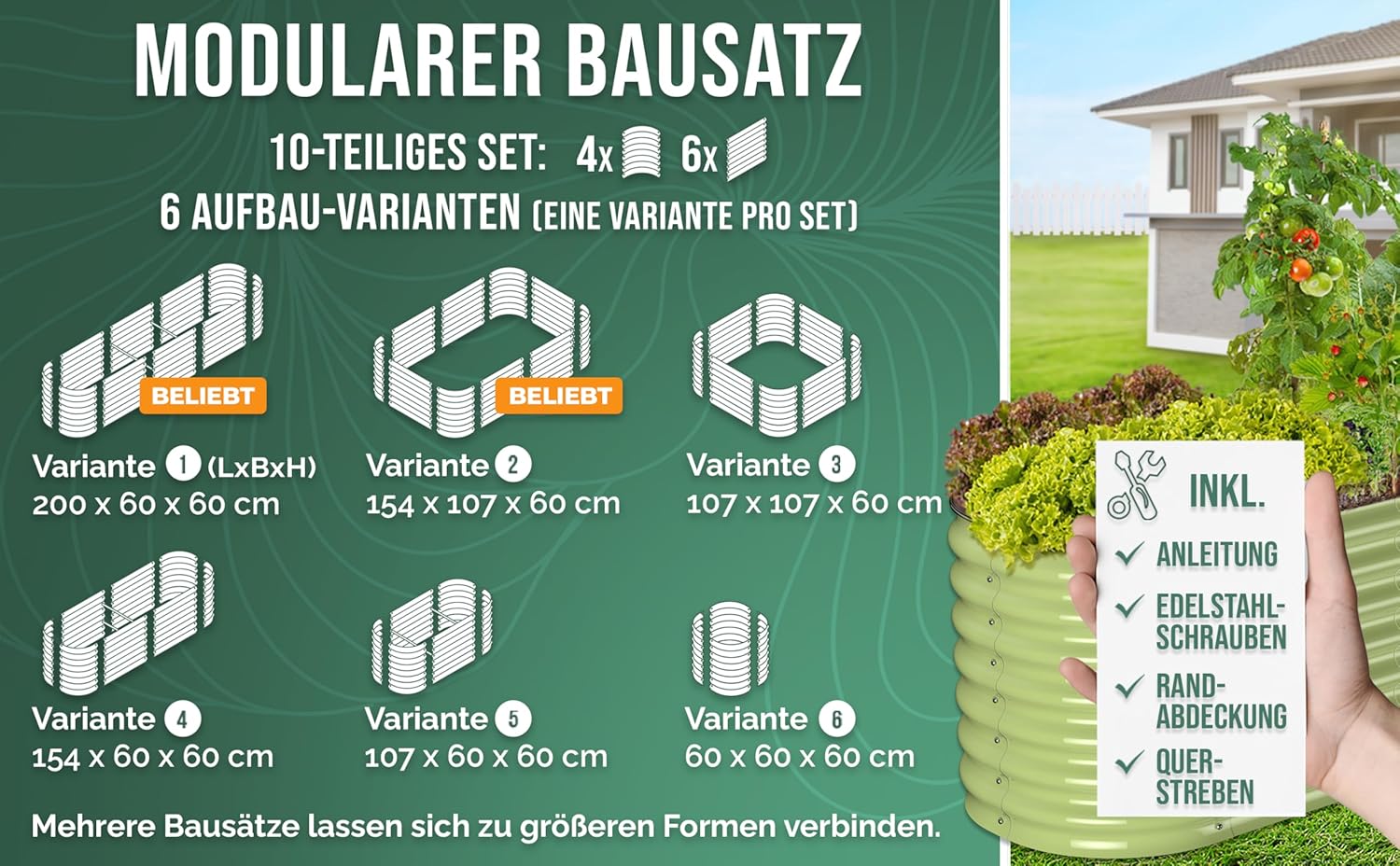 GlücksmomentHOFGARTEN Metall Hochbeet 200x60x60 cm, 6-in-1 Hochbeete-Kit für den Garten, rostfrei & extrem stabil – für Gemüse, Kräuter & Blumen – Salbei (Grün)