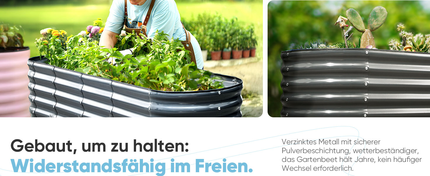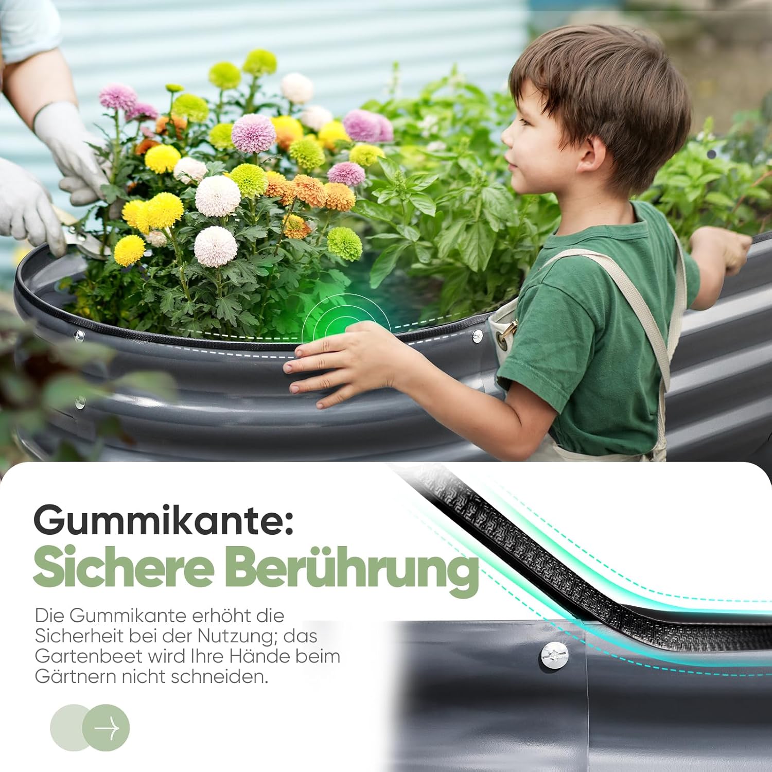 【Gummikanten】Die Kanten des Hochbeet-Bausatzes sind gerollt und mit Gummikanten versehen, um scharfe Kanten zu vermeiden. So können Sie sicher sein, dass Sie sich beim Zusammenbau und Bepflanzen nicht die Hände schneiden und die Freude am Gärtnern unbeschwert genießen können.