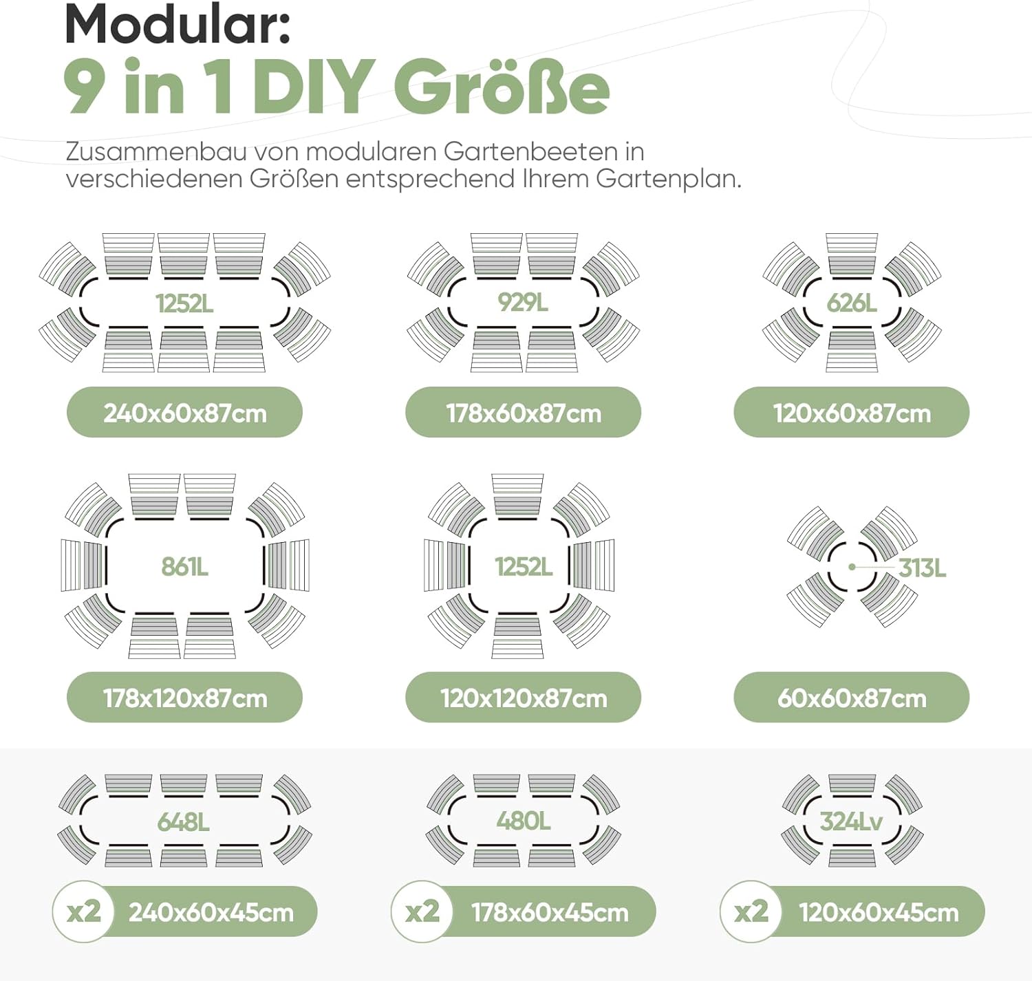【Gestalten Sie Ihren Garten individuell】Das Hochbeet von KING BIRD verfügt über ein modulares Design, sodass Sie es flexibel in sechs verschiedenen Größen konfigurieren können. Egal, ob Sie einen geräumigen Garten oder eine schmale Ecke haben, es lässt sich leicht anpassen. Wählen Sie die ideale Größe, um Ihre Gartenträume nach Belieben zu verwirklichen.