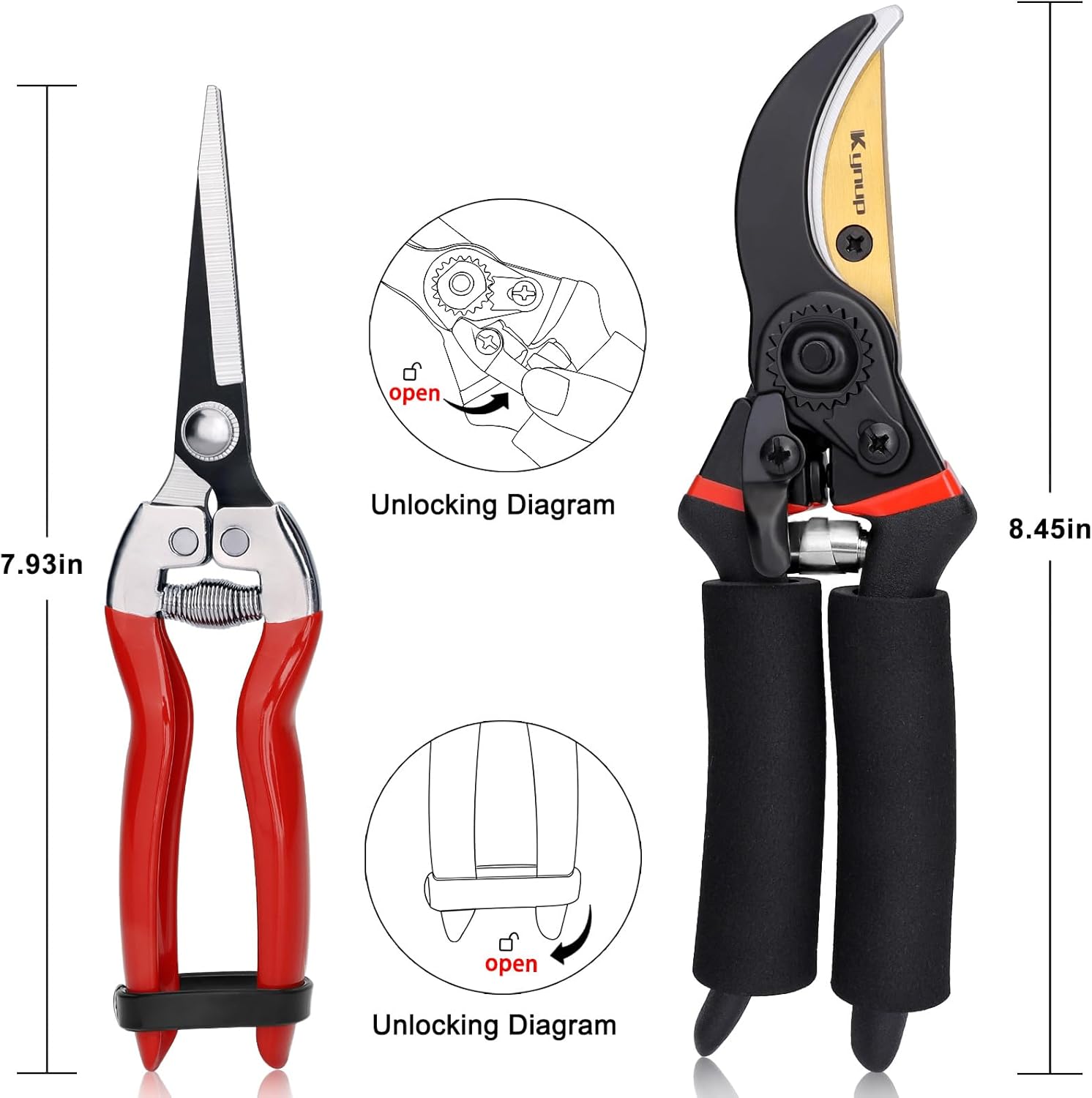 【Sicher zu benutzen】Unsere rosenschere verfügen über einen Sicherheitsverschluss, der die scharfen Klingen bei Nichtgebrauch sicher verschlossen hält.The safety lock is simple and safe to operate and will not lock accidentally during use.