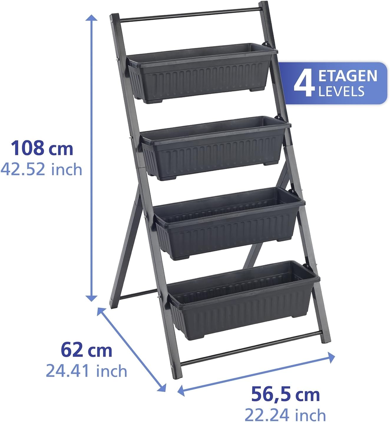 Im Lieferumfang: Sie erhalten ein 4-stufiges Hochbeet mit robustem Rahmen aus pulverbeschichtetem Vierkantrohr (56,5 x 108 x 62 cm) und 4 Blumenkästen (je 49 x 14 x 20,5 cm)