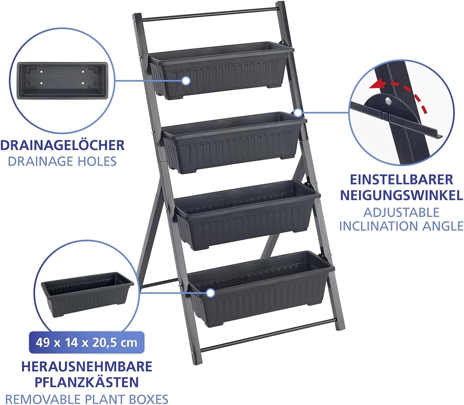 Dieses einzigartige, vierstufige Hochbeet zeichnet sich durch seinen stabilen Dreiecksrahmen aus pulverbeschichtetem Vierkantrohr (2,5 x 2,5 cm) aus, der durch zusätzliche Querstreben verstärkt wird, um eine hohe Stabilität zu gewährleisten. Das schräge Design und die versetzt angeordneten Blumenkästen sorgen dafür, dass Pflanzen auf jeder Ebene optimal mit Sonnenlicht versorgt werden, was ein prächtiges Wachstum fördert. Der Neigungswinkel der Kästen kann an der seitlichen Aufhängung individuell eingestellt werden, um die besten Wachstumsbedingungen zu schaffen.