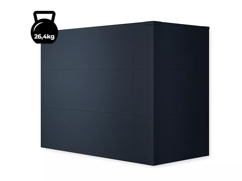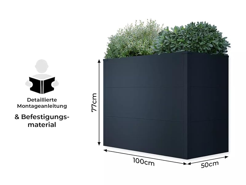 Verzinktes Stahlblech, witterungsbeständig dank pulverbeschichtem Anthrazitgrau RAL 7016 (Stärke 1mm)Schrauben und Befestigungsmaterial aus rostfreiem EdelstahlGewicht 26,4kgFormstabilität dank Mittelstrebe auch bei vollständiger Befüllung, Regen und nasser Erde