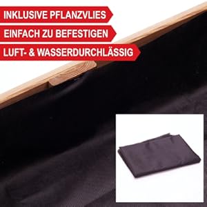 Zu jedem Pflanzrahmen wird das passende luft- und wasserdurchlässige Innenvlies mitgeliefert. Das Vlies ist wetterbeständig und reißfest, wodurch das Holz optimal geschützt wird. Das Pflanzvlies können Sie ganz einfach z.B. mit Tackernadeln oder Heftzwecken an der Innenseite des Beetrahmens befestigen.