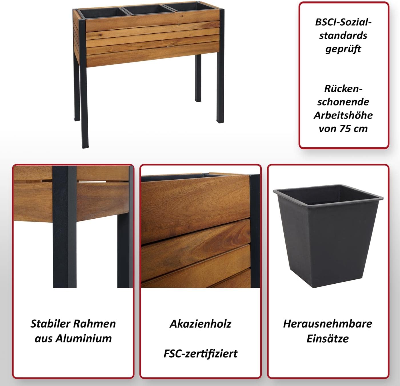 Mit herausnehmbaren Einsätzen | BSCI-Sozialstandards geprüft | Rückenschonende Arbeitshöhe von 75 cm | FSC-zertifiziert (N004267) | Outdoor geeignet | Stabiler Rahmen aus Aluminium | Boden des Einsatzes ist komplett verschlossen (keine Löcher)