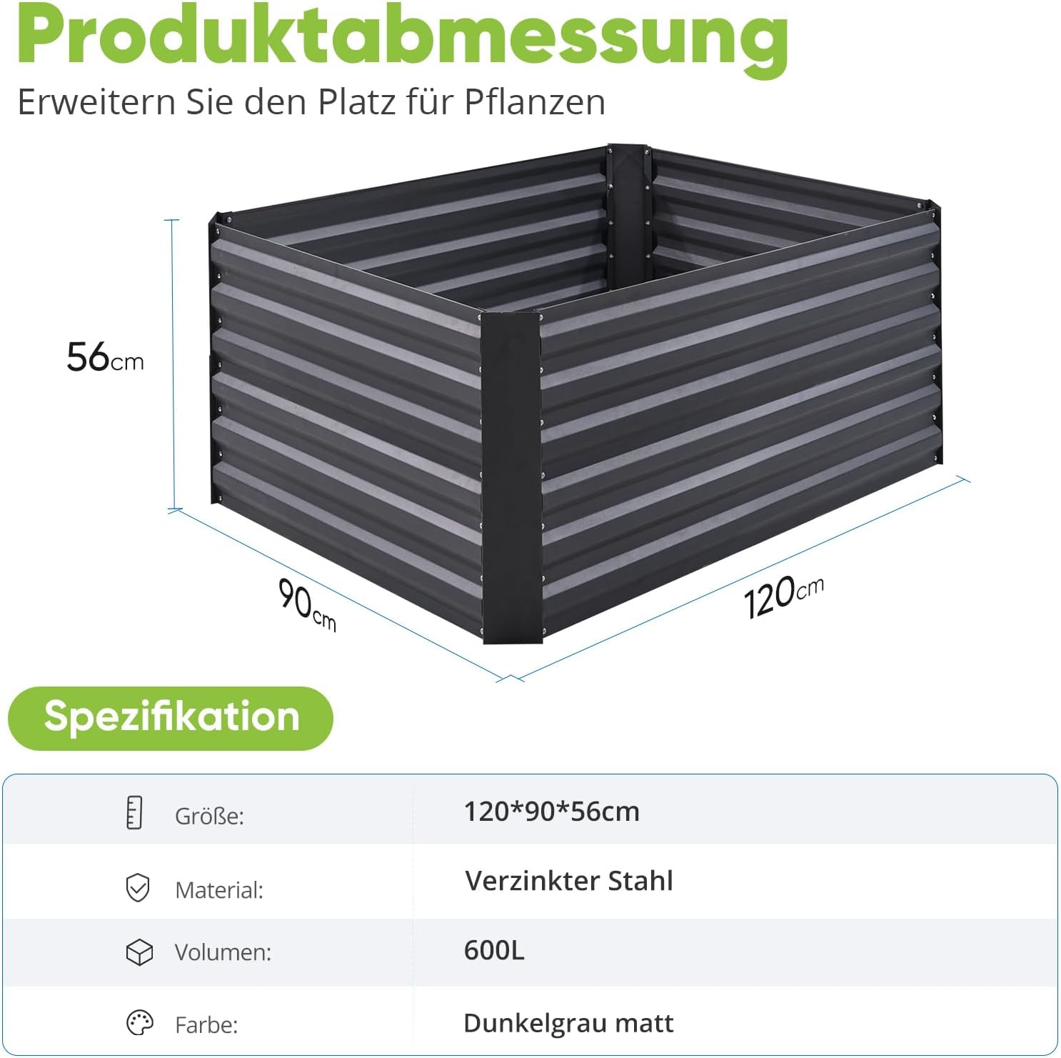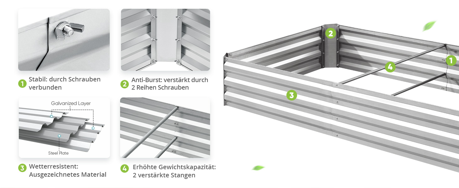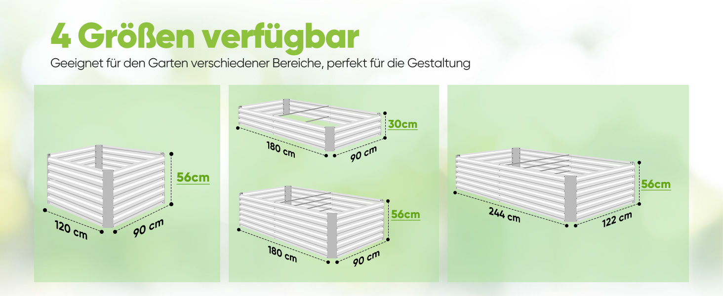 In den Einkaufswagen In den Einkaufswagen In den Einkaufswagen In den Einkaufswagen Kundenrezensionen 4,4 von 5 Sternen 73 4,4 von 5 Sternen 2.779 4,4 von 5 Sternen 47 4,3 von 5 Sternen 176 4,4 von 5 Sternen 73 4,4 von 5 Sternen 2.779 4,4 von 5 Sternen 47 Preis — 129,99 €€129,99 — 119,99 €€119,99 69,29 €€69,29 — 115,49 €€115,49 Verfügbare Größe 180 x 90 x 30cm 174x90x60cm 180 x 90 x 62cm 122×61×142cm 120 x 90 x 56cm 258x90x60cm 240x120x45cm Feste Stange ✔ ✔ ✔ ✔ ✔ ✔ ✔ Material Edelstahl Edelstahl Edelstahl Edelstahl Edelstahl Edelstahl Edelstahl Farbe Garu Garu Garu Silber Garu Silber Garu Garu Garu Silber Form Rechteckig Rechteckig Oval Rechteckig Rechteckig Rechteckig OvalExtra große Kapazität: Das verzinkte Hochbeet von Quictent hat eine extra große Kapazität von 120 x 90 x 56 cm und kann bis zu 600 Liter Erde aufnehmen. Es bietet ausreichend Platz für den Anbau von Kartoffeln, Karotten, Erdnüssen und anderen Wurzelgemüsen. Zudem kann das hohe Gartenbeet kleine Haustiere wie Hühner, Welpen und Kaninchen fernhalten.