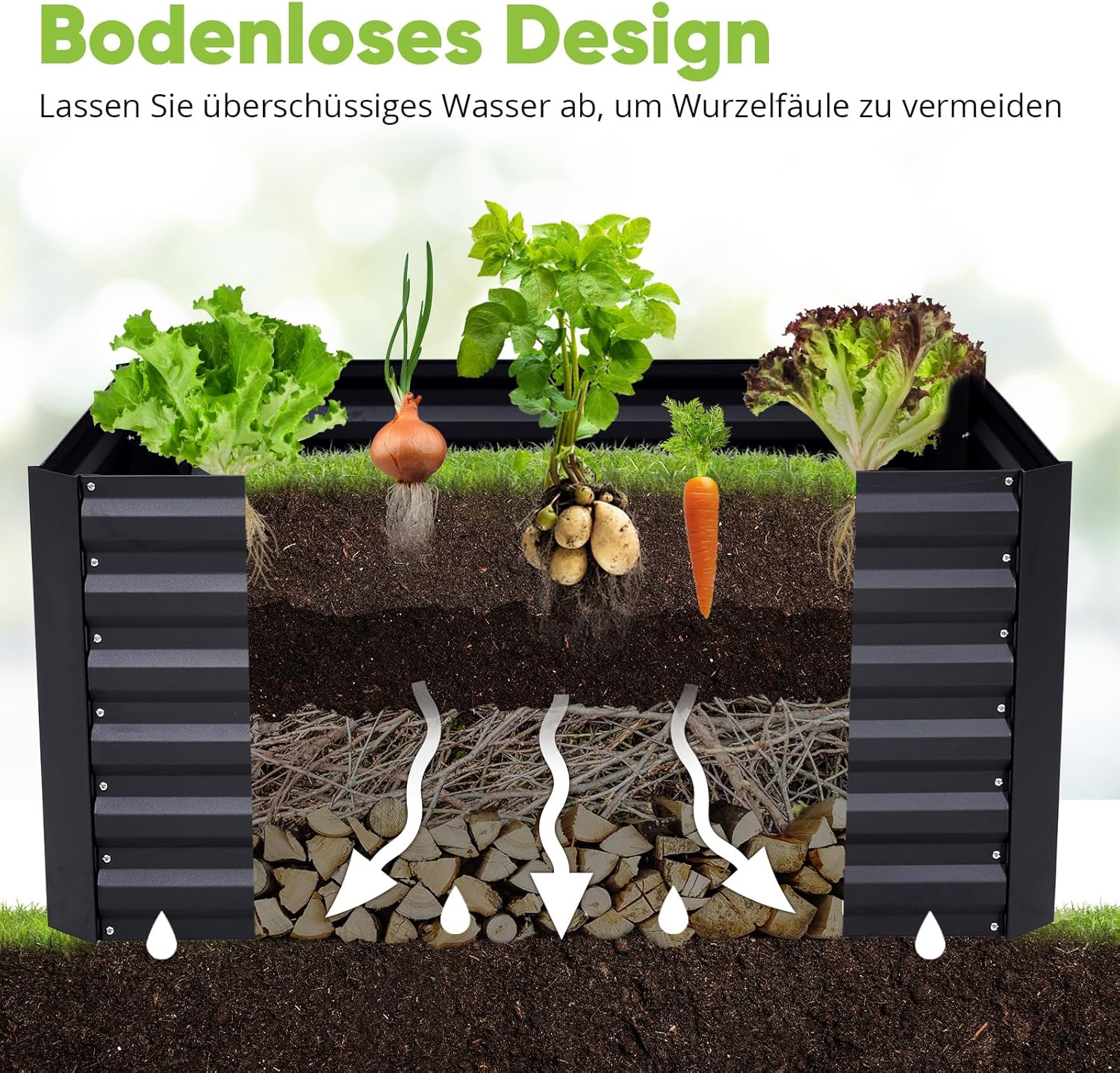 Bodenloses Design: Der offene Boden des Pflanzbeetes aus Metall ist gut für die Drainage, so dass die Wurzeln der Pflanzen nicht durch zu viel Wasser krank werden. Auch die Wurzeln der Pflanzen nicht in Kontakt mit dem Blech, kann die Vielfalt der Nährstoffe aus dem Boden und gesünder wachsen.