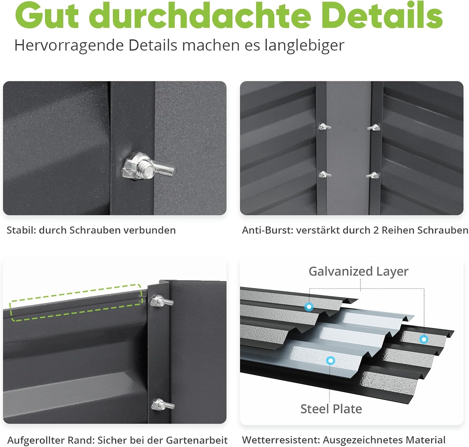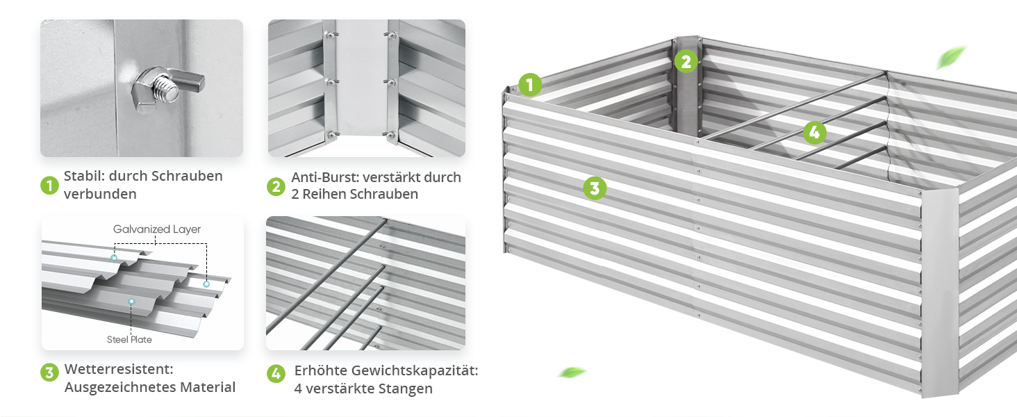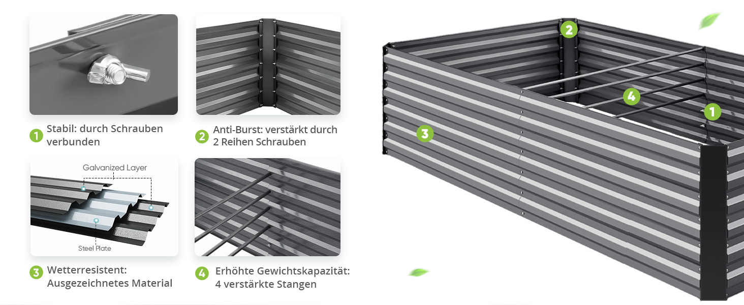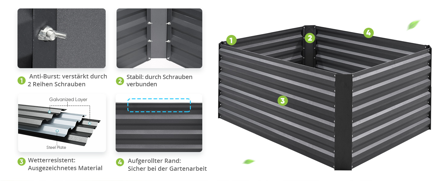 Verstärkt und langlebig: Das Hochbeet für den Garten besteht aus pulverbeschichtetem, verzinktem Stahlblech und sorgt für einen guten Zustand des Metallgartenbeets. Es ist in der Lage, rauen Wetterbedingungen standzuhalten, reißt nicht in Jahren, kann ohne Sorgen verwendet werden.