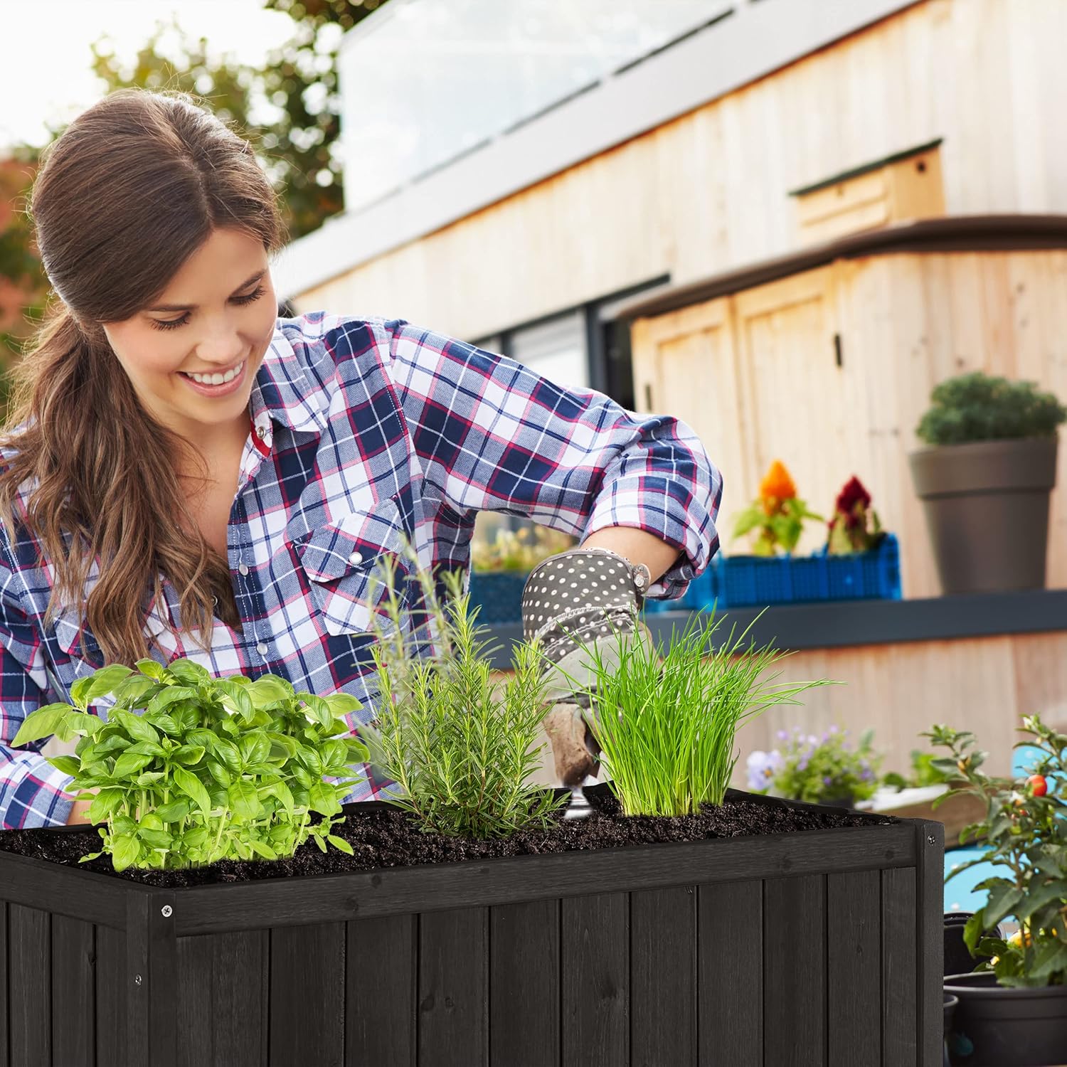 Platzsparend: Schmales Hochbeet zum Gärtnern auf Balkon o. Terrasse – Pflanztisch aus schwarzem Holz