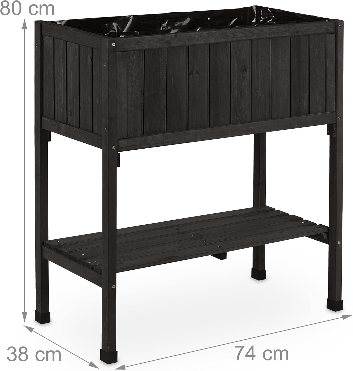 Relaxdays Hochbeet, Folie, Ablage, HxBxT: 80 x 74 x 38 cm, Garten, Balkon & Terrasse, Pflanztisch, Tannenholz, schwarz